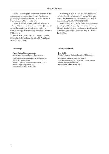 Целью данной работы является артикуляция структурных связей между расщепленным субъектом в рамках фрейдовского и лакановского психоанализа и децентрированным дискурсом в рамках (пост)структуралистского философствования на материале работ Деррида. Как психоанализ, так и проект Деррида оказываются особого рода не-регионалистскими (в смысле региональных онтологий) проектами, пытающимися артикулировать и продемонстрировать то, что упускается в классической метафизике присутствия. Как психоанализ, так и деконструкция направлены на то, чтобы вырвать у присутствия примат его трансцендентности, показать, что «центральный» элемент письма является эффектом самого этого письма, но не точкой референции, к которой это письмо якобы отсылает. Субъективность также оказывается не точкой самоналичия и самотождественности, а эффектом структуры. Субъективность обнаруживает себя в пространстве письма, а само письмо оказывается топосом субъективности. Обнаружить следы психоанализа в работах Деррида можно посредством сопоставления концепта différance Деррида и понятия последействия Фрейда: именно через особую трактовку темпоральности как прошлого, которое никогда не было настоящим, можно осуществить акт деконструкции как акт разрушения всякого акта (поскольку акт оказывается отнесенным к субъекту). Результатом работы является определенная рационализация différance, которое оказывается «сердцем» деконструкции у раннего Деррида, и такая рационализация осуществляется через сопоставление с функционированием последействия в структуре травмы. Субъект тем самым оказывается принципиально разорванным, и этот разрыв является конститутивным для субъективности как таковой, субъект обнаруживает в письме след себя самого, но никогда не может обрести полного, чистого самоналичия. Новизна данной работы заключается в том, что проработке этой структурной взаимосвязи на уровне понятий, как правило, не уделяют должного внимания; в данной работе предлагается такая интерпретация, которая прослеживает взаимосвязь между деконструкцией и психоанализом не в общем, а на уровне связи концептов différance и последействия (а также бессознательного вообще), что позволяет прояснить употребление этих понятий во взаимосвязи, а также проливает свет на смежные понятия субъекта и письма.