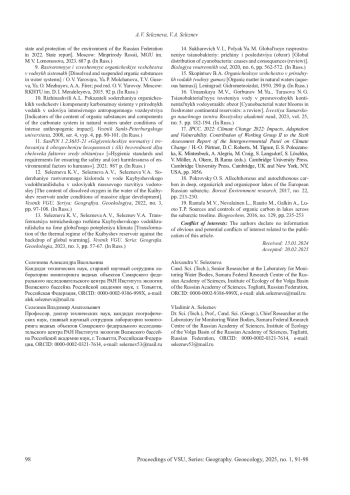 6. Моисеенко Т. И., Дину М. И. Биогеохимия природных органических веществ в водах суши: распределение и изменчивость при потеплении климата // Геохимия, 2023, т. 68, №2, с. 187-196. EDN: CLVOCI