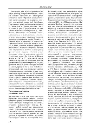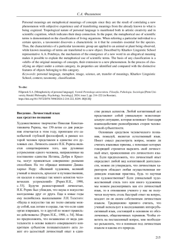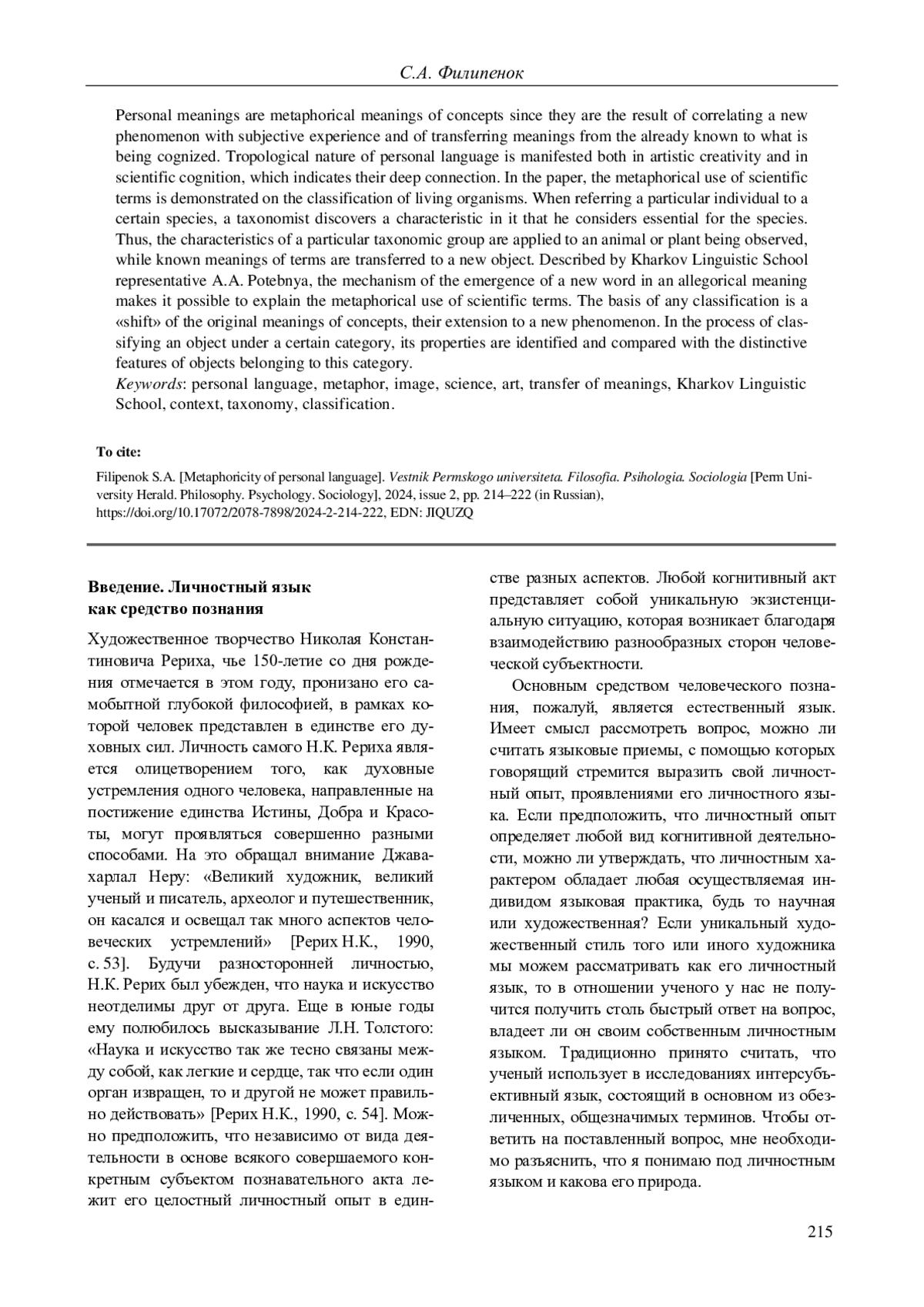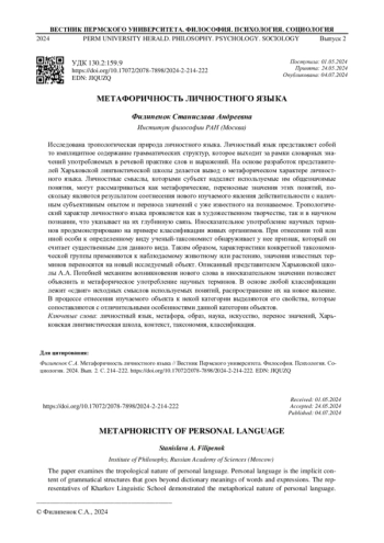 ФИЛИПЕНОК С. А. МЕТАФОРИЧНОСТЬ ЛИЧНОСТНОГО ЯЗЫКА // ВЕСТНИК ПЕРМСКОГО УНИВЕРСИТЕТА. ФИЛОСОФИЯ. ПСИХОЛОГИЯ. СОЦИОЛОГИЯ. 2024. № 2