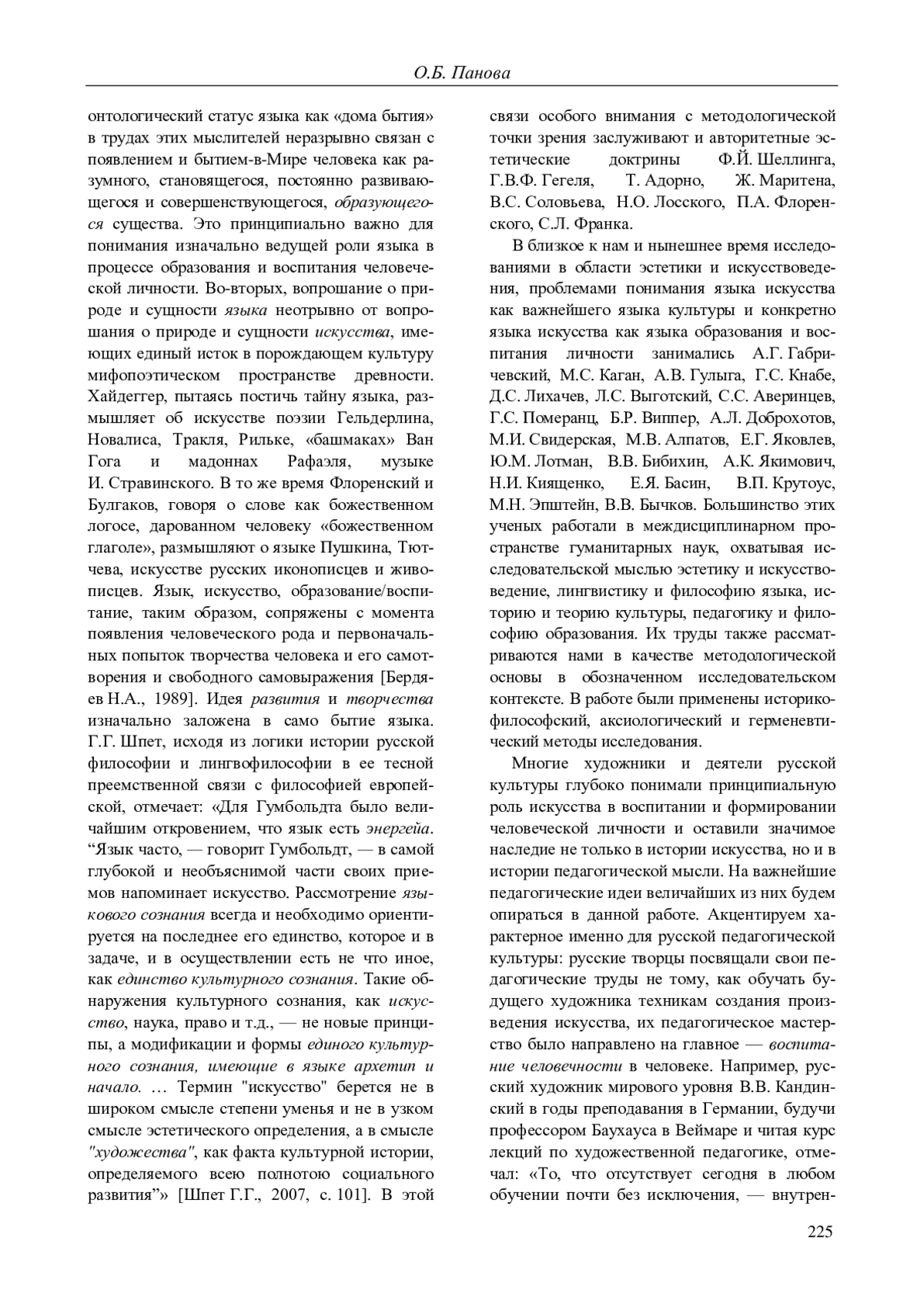 В статье обосновывается роль и значение языка искусства для воспитания человеческой личности. Автор опирается на достижения русской философии, русской педагогической мысли, русской эстетики и искусствоведения, отраженные в трудах В. С. Соловьева, Н. К. Рериха, Е. И. Рерих, Н. А. Бердяева, Н. О. Лосского, Д. С. Лихачева. Особое внимание уделяется художественно-эстетическому опыту, художественным открытиям и теоретическим работам В. В. Кандинского, К. Малевича, М. Шагала, Н. К. Рериха. Рассматриваются основные функции языка искусства - эстетическая, этическая и аксиологическая. Акцентируется необходимость их учета в преподавании гуманитарных дисциплин (философии, теории и истории культуры, теории и истории искусства, истории русской культуры и искусства) на русском языке с целью повышения культурного уровня современной молодежи, как русских, так и иностранных учащихся. Автор приходит к выводу, что более глубокое постижение русской культуры и русской истории и приобщение к основополагающим ценностям русского народа через личный эстетический опыт человека возможно именно на языке искусства. Более того, искусство способствует изменению мировоззрения человека и его личности в нравственном отношении, формированию его личных этических принципов и взращиванию в нем высоких идеалов Истины-Добра-Красоты в целом.