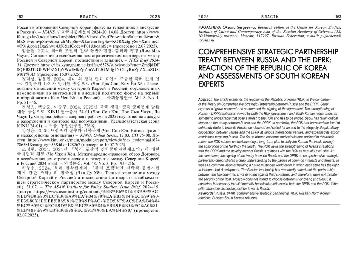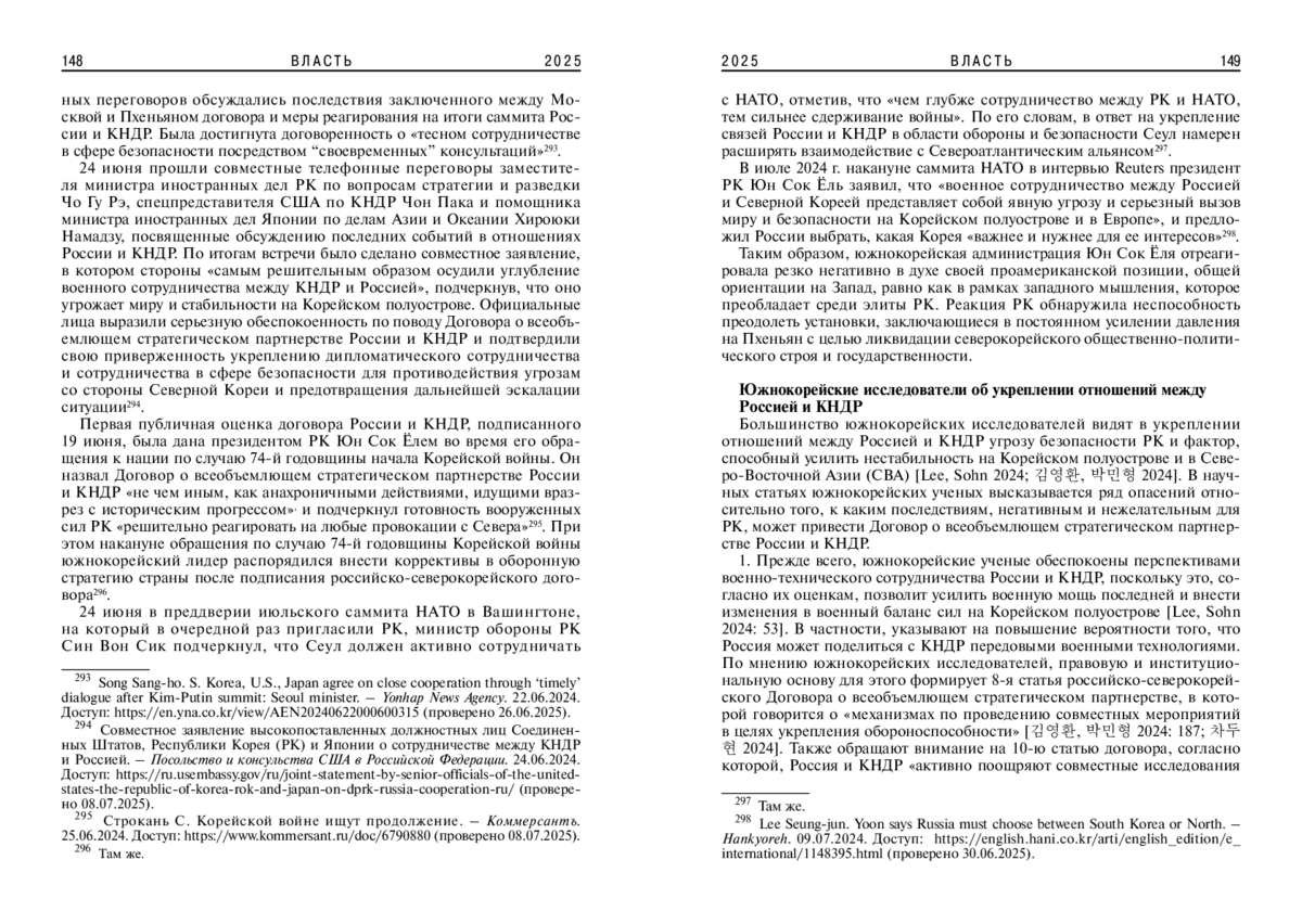2. Choi Wooseon. 2024. The North Korea-Russia Alliance and Korea’s Policy. - IFANS. 31.12. Доступ: http://www.ifans.go.kr/knda/ifans/eng/pblct/PblctView.do?csrfPreventionSalt=null&pblctDtaSn=14428&menuCl=&clCode=P19&koreanEngSe=ENG&pclCode=&chcodeId=&searchCondition=searchAll&searchKeyword=&pageIndex=1 (проверено 11.07.2025).