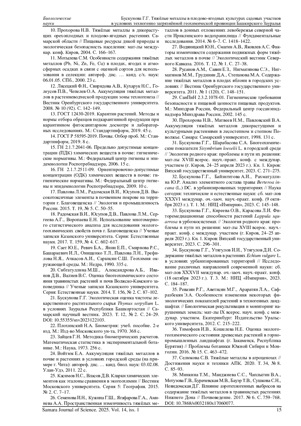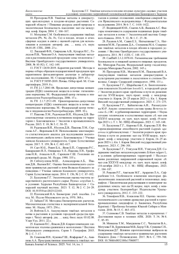 30. Прохорова Н.В., Матвеев Н.М., Павловский В.А. Аккумуляция тяжёлых металлов дикорастущими и культурными растениями в лесостепном и степном Поволжье. Самара: Самарский университет, 1998. 131 с.