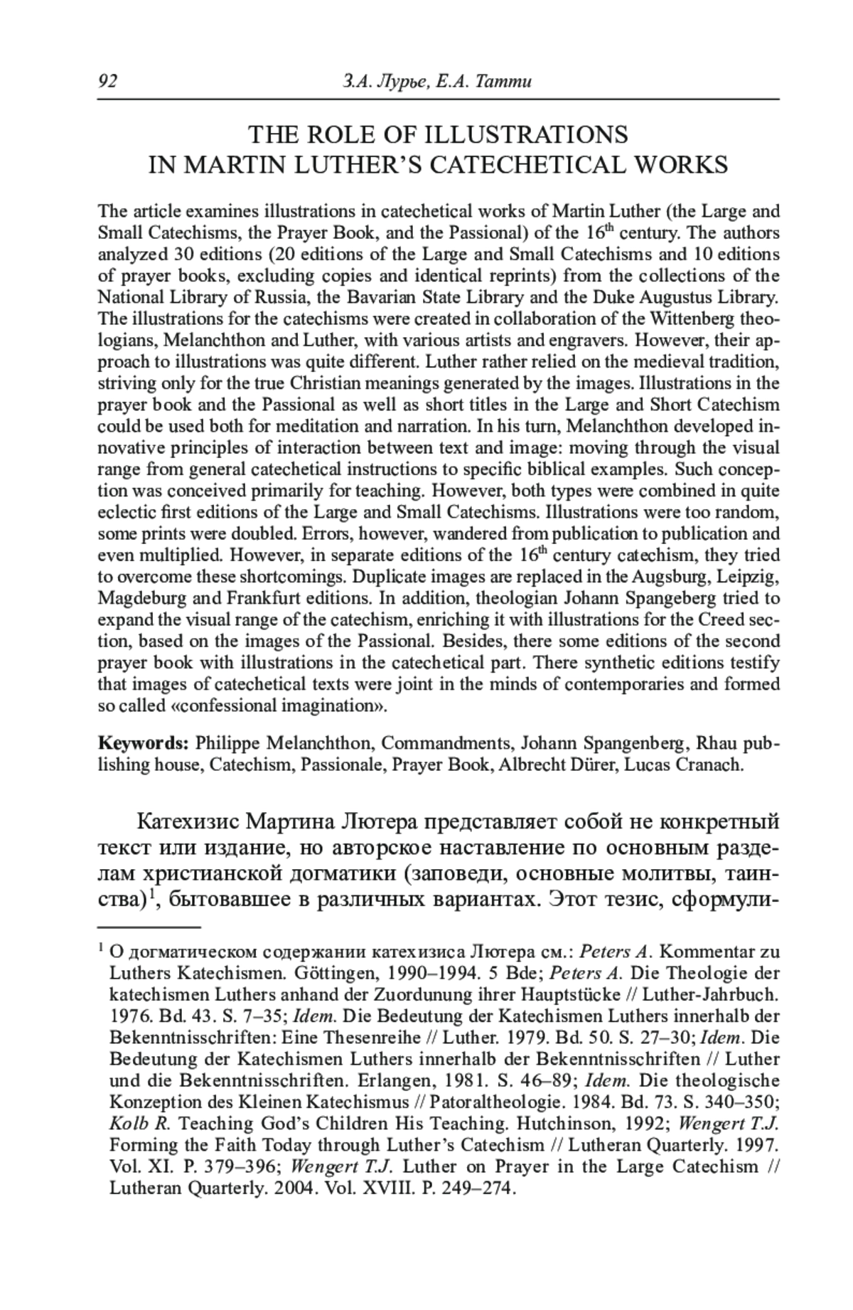 В статье рассматриваются иллюстрации в катехистических произведениях Мартина Лютера XVI в. – Большом и Кратком катехизисах, молитвослове, Пассионале. Авторы проанализировали 30 переизданий (20 – Большого и Краткого катехизиса и 10 – молитвословов, не учитывая копии и идентичные издания) из собраний РНБ, Баварской государственной библиотеки и Библиотеки герцога Августа. Иллюстрации к катехизисам были созданы в сотрудничестве виттенбергских теологов, Филиппа Меланхтона и Мартина Лютера, с различными художниками и граверами. Однако их подход к иллюстрациям довольно сильно разнился. Лютер, скорее, опирался на средневековую традицию, стремясь лишь к христоцентричности порождаемых образами смыслов: иллюстрации в молитвослове, пассионале, шмуцтитулы в Большом и Кратком катехизисе предназначались как для благочестивого размышления, так и для наглядного обучения. Меланхтон разработал новаторские принципы взаимодействия текста и образа, переходя через визуальный ряд от уровня обобщений к конкретным библейским примерам. Оба типа иллюстраций были объединены в изданиях Большого и Краткого катехизиса. Очевиден и заметен дисбаланс в распределении иллюстраций по разделам, а также наличие дублей. Ошибки повторялись из издания в издание. Лишь в отдельных переизданиях катехизиса XVI в. можно увидеть попытки преодолеть эти недостатки. Речь идет, в первую очередь, о замене дублирующих изображений. Кроме того, в некоторых изданиях была сделана попытка расширить визуальный ряд катехизиса, обогатив его иллюстрациями к разделу Символ веры, основываясь на образах пассионала (версия Иоганна Шпангенберга). Известно и издание второго молитвослова, дополненное иллюстрациями катехистической части. Существование таких синтетических изданий свидетельствуют о единстве в сознании современников иллюстраций катехистических текстов, формировавших визуальное ядро «конфессионального воображения».