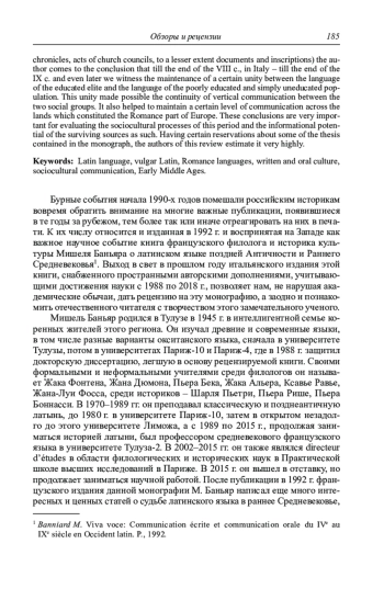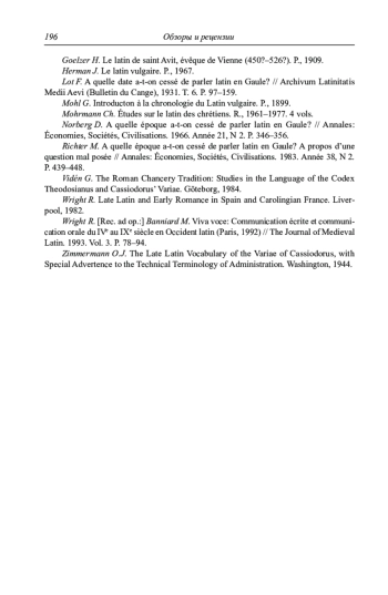 Рецензируемая монография представляет собой переиздание этой книги, вышедшее в свет на французском языке в 1992 г., дополненное автором с учетом новейших исследований. Она содержит богатый материал по истории латинского языка Поздней Античности и Раннего Средневековья и формирования на его основе западно-романских языков, но не является систематическим изложением фактов, характеризующих этот процесс. Перед нами исследование одного из важнейших его аспектов: соотношения в эту эпоху литературного латинского языка, с одной стороны, и разговорного – с другой. Анализируя самые разные источники (трактаты, проповеди, жития святых, хроники, акты церковных соборов, в меньшей мере документы и надписи), автор приходит к выводу, что до конца VIII в., в Италии – до конца IX в. и даже позднее, сохранялось определенное единство между языком образованной элиты и языком плохо или вовсе не образованного населения, что обеспечивало вертикальную коммуникацию между этими социальными группами. Сохранялась и возможность коммуникации на одном языке во всем ареале романской части Европы. Эти выводы очень важны для осмысления социокультурных процессов данной эпохи и информативности дошедших до нас источников. Критически воспринимая некоторые выводы, содержащиеся в данной книге, авторы рецензии оценивают ее очень высоко.