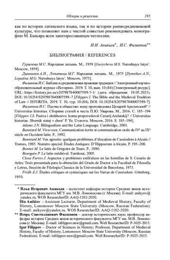 АНИКЬЕВ И. И., ФИЛИППОВ И. С. BANNIARD M. VIVA VOCE: COMUNICAZIONE SCRITTA E COMUNICAZIONE ORALE NELL’OCCIDENTE LATINO DAL IV AL IX SECOLO / EDIZIONE ITALIANA CON UNA RETRACTATIO DELL’AUTORE, A CURA DI L. CRISTANTE E F. ROMANINI, CON LA COLLABORZIONE DI J. GESIOT E V. VERONESI. TRIESTE: EDIZIONE UNIVERSITÀ DI TRIESTE, 2020. XVIII, 716 P. (POLYMNIA: STUDI DI FILOLOGIA CLASSICA; 25). БАНЬЯР М. ЖИВАЯ РЕЧЬ: ПИСЬМЕННАЯ И УСТНАЯ КОММУНИКАЦИЯ НА ЛАТИНСКОМ ЗАПАДЕ С IV ПО IX ВЕК / ИТАЛ. ИЗД. С ДОПОЛНЕНИЯМИ АВТОРА; ПОД РЕД. Л. КРИСТИАНИ И Ф. РО // СРЕДНИЕ ВЕКА. 2021. Т. 82 № 3