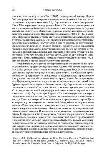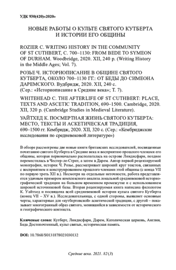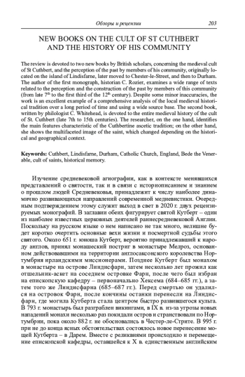 Статья: НОВЫЕ РАБОТЫ О КУЛЬТЕ СВЯТОГО КУТБЕРТА И ИСТОРИИ ЕГО ОБЩИНЫ. ROZIER C. WRITING HISTORY IN THE COMMUNITY OF ST CUTHBERT, C. 700-1130: FROM BEDE TO SYMEON OF DURHAM. WOODBRIDGE, 2020. XII, 240 P. (WRITING HISTORY IN THE MIDDLE AGES; VOL. 7). РОЗЬЕ Ч. ИСТОРИОПИСАНИЕ В ОБЩИНЕ СВЯТОГО КУТБЕРТА, ОКОЛО 700-1130 ГГ.: ОТ БЕДЫ ДО СИМЕОНА ДАРЕМСКОГО. ВУДБРИДЖ, 2020. XII, 240 С. (СЕР.: "ИСТОРИОПИСАНИЕ В СРЕДНИЕ ВЕКА"; Т. 7). WHITEHEAD C. THE AFTERLIFE OF ST CUTHBERT: PLACE, TEXTS AND ASCETIC TRADITION, 690-1500. CAMB (2021)
