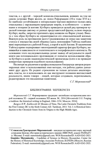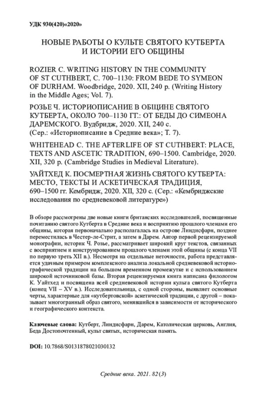 МЕРЕМИНСКИЙ С. Г. НОВЫЕ РАБОТЫ О КУЛЬТЕ СВЯТОГО КУТБЕРТА И ИСТОРИИ ЕГО ОБЩИНЫ. ROZIER C. WRITING HISTORY IN THE COMMUNITY OF ST CUTHBERT, C. 700-1130: FROM BEDE TO SYMEON OF DURHAM. WOODBRIDGE, 2020. XII, 240 P. (WRITING HISTORY IN THE MIDDLE AGES; VOL. 7). РОЗЬЕ Ч. ИСТОРИОПИСАНИЕ В ОБЩИНЕ СВЯТОГО КУТБЕРТА, ОКОЛО 700-1130 ГГ.: ОТ БЕДЫ ДО СИМЕОНА ДАРЕМСКОГО. ВУДБРИДЖ, 2020. XII, 240 С. (СЕР.: "ИСТОРИОПИСАНИЕ В СРЕДНИЕ ВЕКА"; Т. 7). WHITEHEAD C. THE AFTERLIFE OF ST CUTHBERT: PLACE, TEXTS AND ASCETIC TRADITION, 690-1500. CAMB // СРЕДНИЕ ВЕКА. 2021. Т. 82 № 3