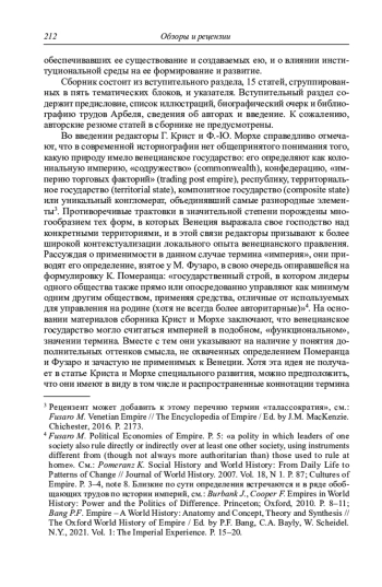 В сборнике, посвященном юбилею Б. Арбеля, одного из крупнейших специалистов по истории Восточного Средиземноморья в раннее Новое время, публикуются материалы семинара, который проходил в Венеции 12– 13 июля 2015 г. и был организован Г. Кристом, М. Дель Рио и Р. Глузманом на базе Государственного архива (Archivio di Stato di Venezia) и Международного университета Венеции (Venice International University). Участники встречи продолжили существующую в науке дискуссию о том, насколько правомерно рассматривать политический организм, образованный городом-государством Венецией, подконтрольными ей территориями на Терраферме (Stato da Terra) и ее заморскими владениями (Stato da Mar), в качестве колониальной империи1.