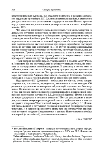 В рецензируемой монографии история дипломатических отношений между ранними Тюдорами (1485–1558) и римской курией изучается в контексте существенных изменений, происходивших во внутренней эволюции европейских национальных государств – в первую очередь, Англии – на рубеже позднего Средневековья и раннего Нового времени, укрепления в них светской власти в ущерб универсалистским притязаниям папства. Этот путь прослеживается автором книги во всей его сложности и противоречивости, учитывая двойственную природу папской власти. Автору удалось показать англо-папскую дипломатию включенной в сложные международные отношения эпохи: Итальянские войны, растущую турецкую угрозу, преодоление последствий Столетней войны и др. Автор подробно анализирует состав английских дипломатических миссий в Риме и, наоборот, их функции, особенности, связанные с тем, что эти дипломаты, находясь на службе английского короля, нередко становились и служителями римской курии