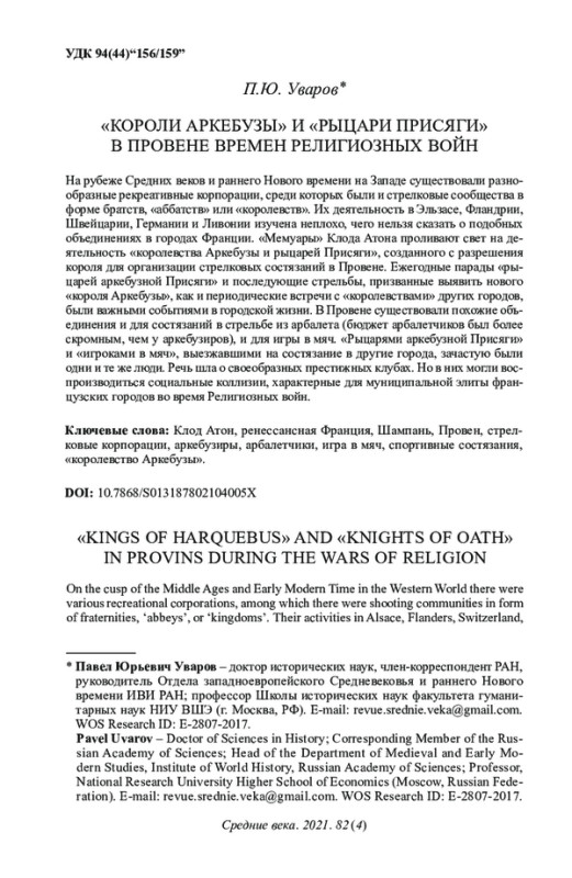 На рубеже Средних веков и раннего Нового времени на Западе существовали разнообразные рекреативные корпорации, среди которых были и стрелковые сообщества в форме братств, «аббатств» или «королевств». Их деятельность в Эльзасе, Фландрии, Швейцарии, Германии и Ливонии изучена неплохо, чего нельзя сказать о подобных объединениях в городах Франции. «Мемуары» Клода Атона проливают свет на деятельность «королевства Аркебузы и рыцарей Присяги», созданного с разрешения короля для организации стрелковых состязаний в Провене. Ежегодные парады «рыцарей аркебузной Присяги» и последующие стрельбы, призванные выявить нового «короля Аркебузы», как и периодические встречи с «королевствами» других городов, были важными событиями в городской жизни. В Провене существовали похожие объединения и для состязаний в стрельбе из арбалета (бюджет арбалетчиков был более скромным, чем у аркебузиров), и для игры в мяч. «Рыцарями аркебузной Присяги» и «игроками в мяч», выезжавшими на состязание в другие города, зачастую были одни и те же люди. Речь шла о своеобразных престижных клубах. Но в них могли воспроизводиться социальные коллизии, характерные для муниципальной элиты французских городов во время Религиозных войн