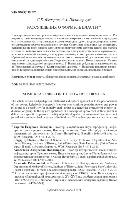 В центре внимания авторов – реляционистские и системные концепции власти. Реляционистские концепции («власть над») рассматривают само явление и присущие ему отношения как открывающие возможность для одного индивида/группы изменять поведение другого индивида или группы. Системные концепции или концепции, основанные на идее «власть для», позиционируют само явление власти как особое безличное свойство политической системы, как присущий этой системе функционал, не принадлежащий индивиду или группе индивидов. Авторы высказывают ряд соображений относительно применения системных концепций для анализа властных отношений западноевропейского Средневековья и раннего Нового времени. Основные элементы выводимой авторами схемы: 1) Власть как субстанциональное явление; 2) Провластный дискурс; 3) Контрвластный дискурс; 4) Властные практики, являющиеся генерализацией исходных дискурсов, иными словами, власть как процесс