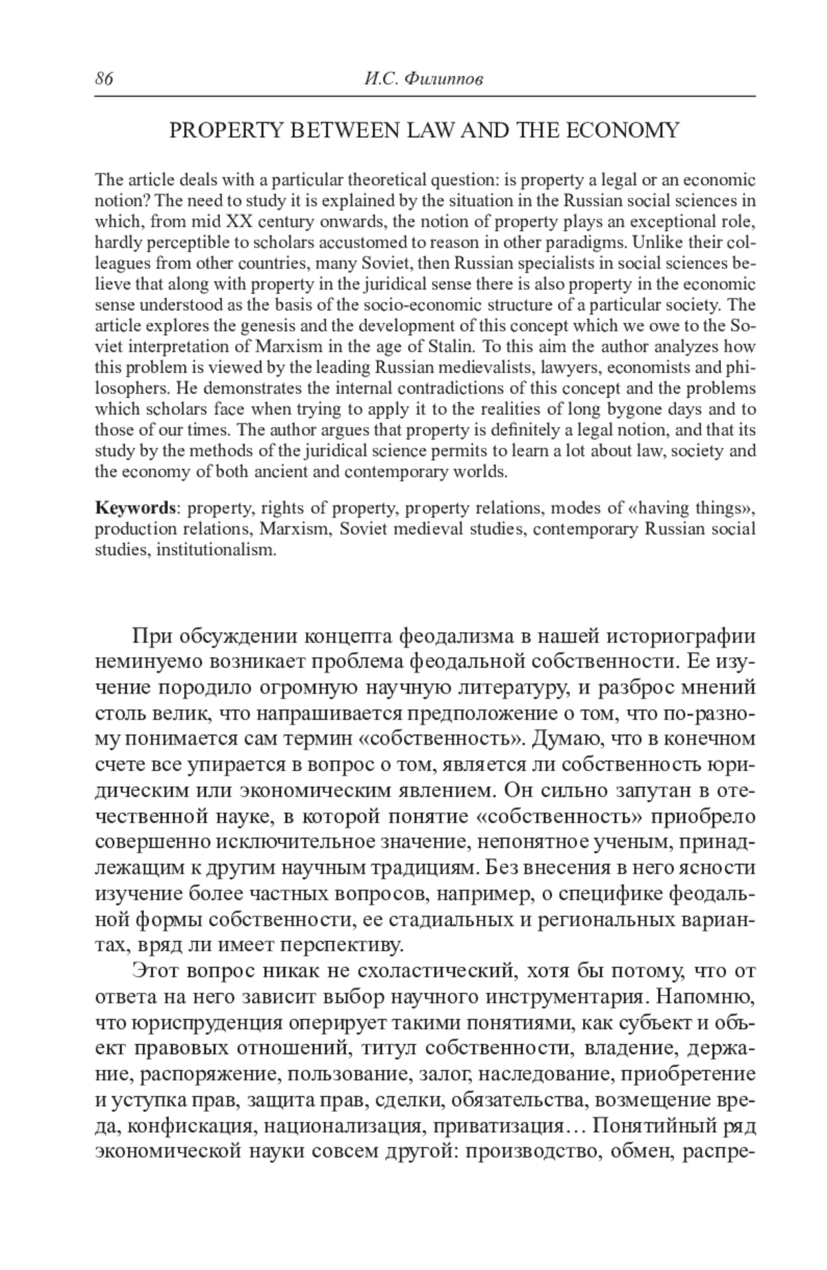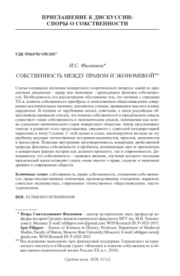 Статья посвящена изучению конкретного теоретического вопроса: какой из двух научных дисциплин – праву или экономике – принадлежит феномен собственности. Необходимость его рассмотрения обусловлена тем, что начиная с середины XX в. понятие собственности приобрело в отечественном обществоведении совершенно исключительное значение, непонятное ученым, привыкшим мыслить в иных парадигмах. В отличие от зарубежных коллег, советские, а затем российские обществоведы привыкли считать, что помимо собственности в юридическом смысле существует также собственность в экономическом смысле, понимаемая как основа социально-экономического строя конкретного общества. Автор прослеживает генезис и развитие этого представления, связанного с советской интерпретацией марксизма в эпоху Сталина. С этой целью в статье анализируются взгляды на эту проблему ведущих отечественных историков-медиевистов, юристов, экономистов и философов. Показана внутренняя противоречивость концепции двойственной природы феномена собственности и проблемы, возникающие при ее применении к конкретным фактам истории как далекого прошлого, так и современности. Доказывается, что собственность – правовое явление, изучение которого методами юридической науки позволяет узнать очень многое о праве, социуме и экономике древних и современных обществ.