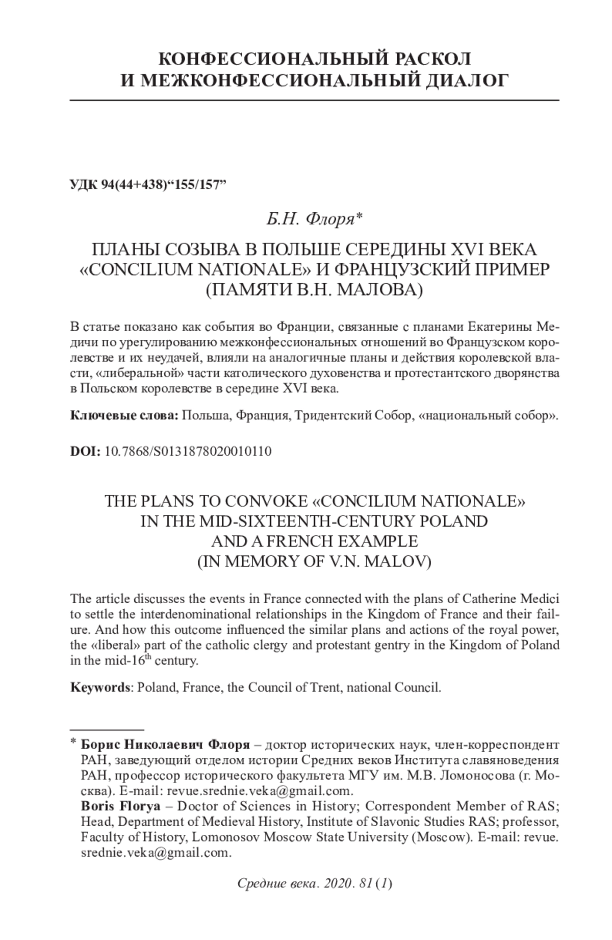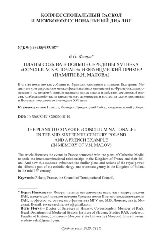 ФЛОРЯ Б. Н. ПЛАНЫ СОЗЫВА В ПОЛЬШЕ СЕРЕДИНЫ XVI ВЕКА "CONCILIUM NATION ALE" И ФРАНЦУЗСКИЙ ПРИМЕР (ПАМЯТИ В. Н. МАЛОВА) // СРЕДНИЕ ВЕКА. 2020. Т. 81 № 1