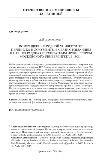 Публикуются архивные документы, освещающие главные моменты избрания всемирно известного историка П. Г. Виноградова сверхштатным профессором Московского университета в 1908 г. Публикатор подробно характеризует перипетии процесса, в котором проявились различия в понимании условий нормальной образовательной деятельности историком, жившим в Англии, и профессорами Московского университета, а также разногласия между последними. Публикуемые документы хранятся в фонде Московского императорского университета Центрального государственного архива г. Москвы и в фонде Министерства народного просвещения Российского государственного исторического архива в Санкт-Петербурге. Их тексты приведены в соответствие с современными нормами орфографии и дополнены необходимыми детальными комментариями, позволяющими лучше раскрыть их смысл и значение