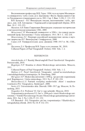 3. Воспоминания профессора В.И. Герье: 1894 год в истории Московского университета / публ. и ком. Д. А. Цыганкова // Вести. Православного Свято-Тихоновского гуманитарного ун-та. 2011. Сер. 2. Вып. 1 (38). С. 131-152.