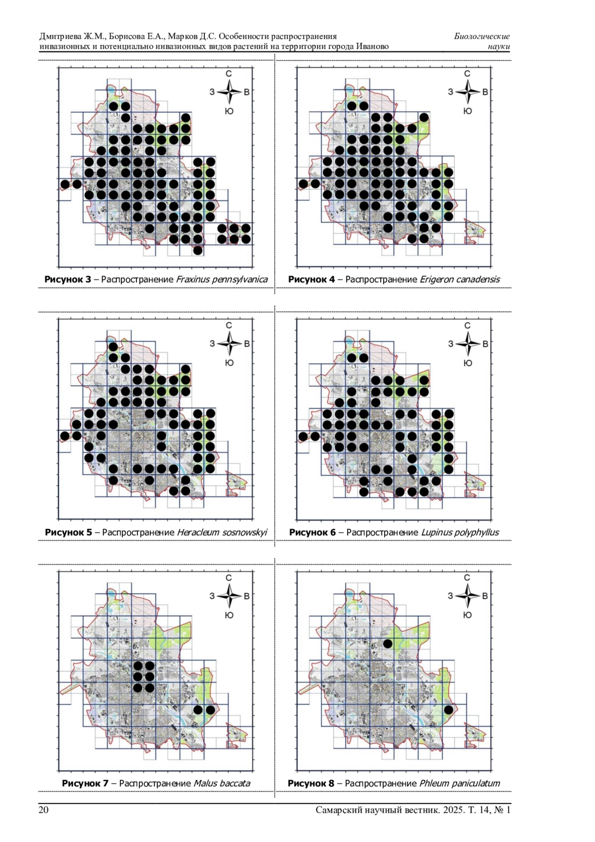 13. Борисова Е.А., Дмитриева Ж.М. Инвазионные виды растений в природных экотопах города Иваново // Фиторазнообразие Восточной Европы. 2024. Т. 18, № 1. С. 18-29. DOI: 10.24412/2072-8816-2024-18-1-18-29 EDN: JKYIEP