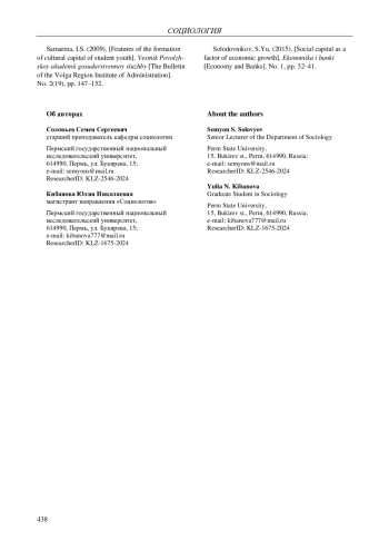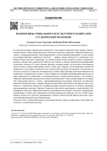 СОЛОВЬЕВ С. С., КИБАНОВА Ю. Н. ВЗАИМОСВЯЗЬ СОЦИАЛЬНОГО И КУЛЬТУРНОГО КАПИТАЛОВ СТУДЕНЧЕСКОЙ МОЛОДЕЖИ // ВЕСТНИК ПЕРМСКОГО УНИВЕРСИТЕТА. ФИЛОСОФИЯ. ПСИХОЛОГИЯ. СОЦИОЛОГИЯ. 2024. № 3