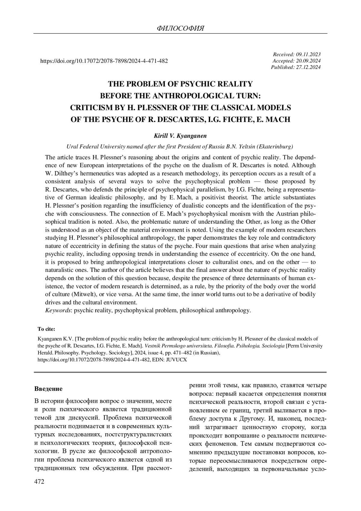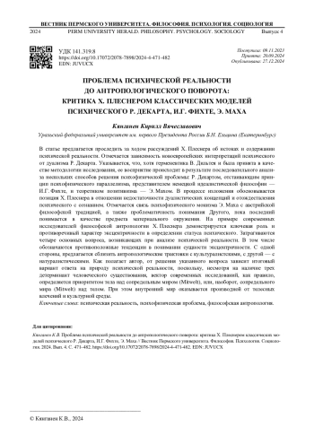 В статье предлагается проследить за ходом рассуждений Х. Плеснера об истоках и содержании психической реальности. Отмечается зависимость новоевропейских интерпретаций психического от дуализма Р. Декарта. Указывается, что, хотя герменевтика В. Дильтея и была принята в качестве методологии исследования, ее восприятие происходит в результате последовательного анализа нескольких способов решения психофизической проблемы: Р. Декартом, отстаивающим принцип психофизического параллелизма, представителем немецкой идеалистической философии - И. Г. Фихте, и теоретиком позитивизма - Э. Махом. В процессе изложения обосновывается позиция Х. Плеснера в отношении недостаточности дуалистических концепций и отождествления психического с сознанием. Отмечается связь психофизического монизма Э. Маха с австрийской философской традицией, а также проблематичность понимания Другого, пока последний понимается в качестве предмета материального окружения. На примере современных исследователей философской антропологии Х. Плеснера демонстрируется ключевая роль и противоречивый характер эксцентричности в определении статуса психического. Затрагиваются четыре основных вопроса, возникающих при анализе психической реальности. В том числе обозначаются противоположные тенденции в понимании сущности эксцентричности. С одной стороны, предлагается сблизить антропологические трактовки с культуралистскими, с другой - с натуралистическими. Как полагает автор, от решения указанного вопроса зависит итоговый вариант ответа на природу психической реальности, поскольку, несмотря на наличие трех детерминант человеческого существования, вектор современных исследований, как правило, определяется приоритетом тела над сопредельным миром (Mitwelt), или, наоборот, сопредельного мира (Mitwelt) над телом. При этом внутренний мир оказывается производной от телесных влечений и культурной среды.