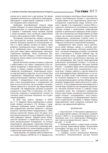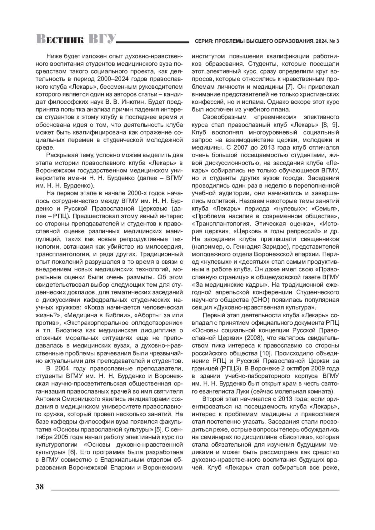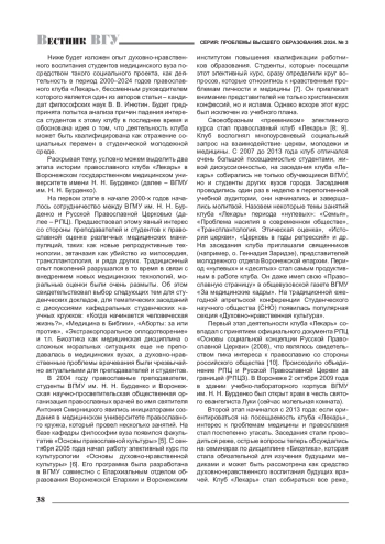 На примере работы студенческого православного клуба изложены изменения во взаимодействии РПЦ и студенческой молодежи. Рассмотрена история студенческого православного клуба «Лекарь» в Воронежском государственном медицинском университете имени Н. Н. Бурденко от появления клуба в начале 2000-х годов до сегодняшнего дня. Сделана попытка проанализировать причины интереса к православной традиции в медицинском вузе в период активной деятельности молодежного клуба. Опыт деятельности молодежного православного клуба показывает, что в студенческой среде произошла определенная социальная трансформация. Православный клуб «Лекарь» за двадцатилетие существования стал проектом педагогического процесса духовно-нравственного воспитания.