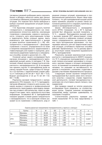 Результаты изучения межличностной интолерантности к неопределенности (МИНТ) показали, что 70 % опрошенных преподавателей в той или иной степени испытывают дискомфорт в отношениях с другими людьми в ситуации неопределенности, не принимают во внимание мнение другого человека, что указывает на нестабильность педагогов в отношениях с коллегами, студентами и другими участниками образовательного процесса. Следующим этапом изучения толерантности преподавателей был анализ связи этого личностного качества с возрастом, стажем педагогической деятельности, половой принадлежностью и наличием или отсутствием ученой степени у преподавателей.