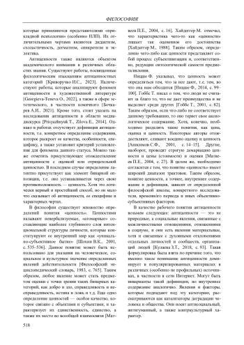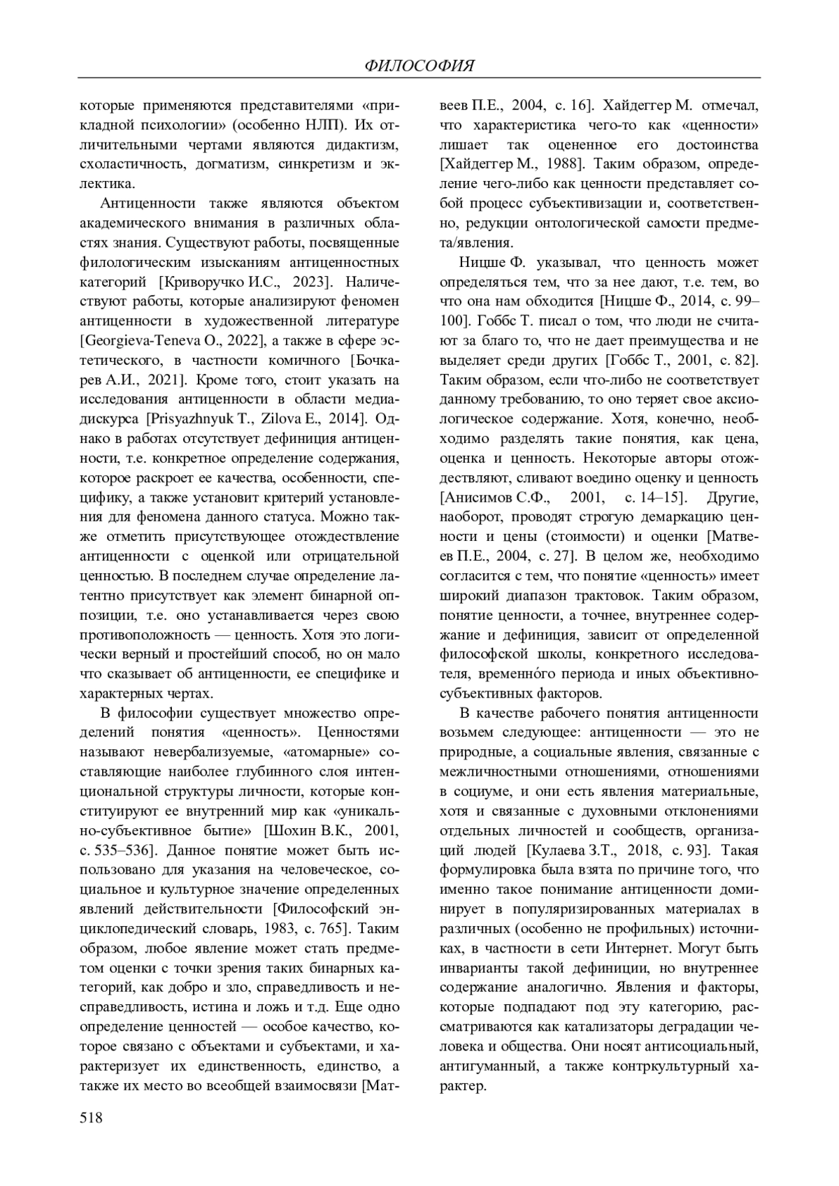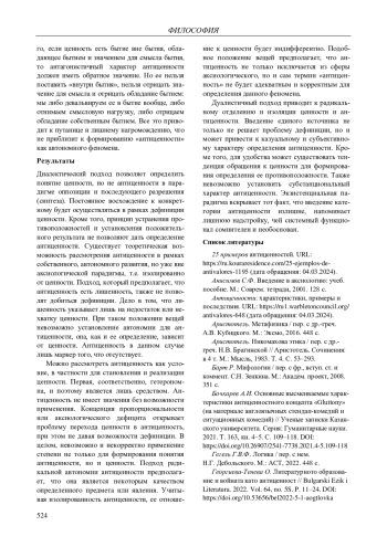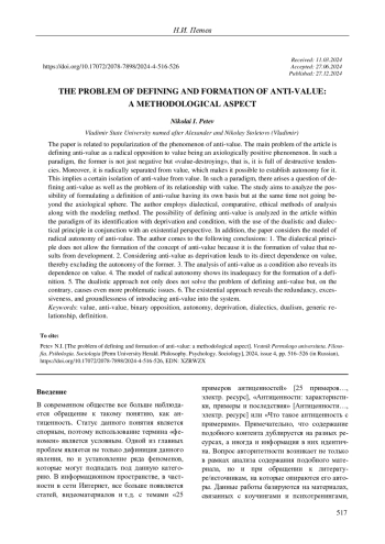 Данная работа связана с популяризации феномена антиценности. Основная проблема: антиценность устанавливается как радикальная оппозиция ценности как явлению аксиологически положительному. Первая в подобной парадигме имеет не просто отрицательный характер, но «ценностно-уничтожающий», т. е. она преисполнена деструктивными тенденциями. Более того, она радикально отделяется от ценности, что дает возможность установить для нее автономию. Последнее же предполагает некую изоляцию антиценности от ценности, которая вызывает вопрос об их взаимоотношении. В такой парадигме возникает вопрос определения антиценности, а также проблематика ее отношения с ценностью. Основная цель: проанализировать возможность формирования дефиниции антиценности, которая будет иметь собственное основание, но вместе с тем не выходящее за рамки аксиологической сферы. Методология: в работе использованы диалектический, сравнительный, этический методы анализа, а также метод моделирования. В данной статье возможность дефиниции антиценности анализируется в парадигме ее отождествления с лишенностью и условием, используя дуалистический и диалектический принципы, а также экзистенциальную перспективу. Кроме того, в работе рассматривалась модель радикальной автономии антиценности. В результате сформулированы определенные выводы: 1. Диалектический принцип не позволяет сформировать понятие антиценности, т. к. в результате развития происходит становление именно ценности. 2. Рассмотрение антиценности как лишенности приводит к прямой зависимости от ценности, исключая тем самым автономию первой. 3. Анализ антиценности как условия также выявляет ее зависимость от ценности. 4. Модель радикальной автономии показывает свою несостоятельность для формирования дефиниции. 5. Дуалистический подход не только не решает вопрос определения антиценности, но и, наоборот, вызывает еще больше проблемных моментов. 6. Экзистенциальный подход выявляет избыточность, чрезмерность и безосновательность ввода антиценности в систему.