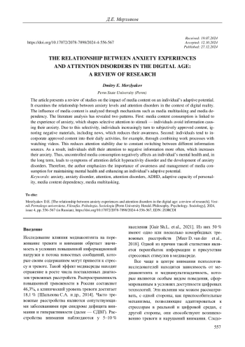 В статье представлен обзор исследований, посвященных влиянию медиаконтента на адаптационный потенциал личности. Рассматривается связь между уровнем тревожности и нарушениями внимания у человека в условиях цифровой реальности. Воздействие медиаконтента анализируется через такие механизмы, как медиамультизадачность и зависимость от медиаконтента. В ходе анализа литературы выявлены две закономерности. Первая: потребление медиаконтента связано с переживанием тревоги, которая формирует избирательность внимания к стимулам: человек избегает информации, вызывающей тревогу. Из-за избирательности человек чаще обращается к материалу, который является субъективно одобряемым, игнорируя негативные материалы, в том числе новостные повестки, что снижает уровень его осведомленности. Вторая: человек стремится включать одобряемый материал в повседневные дела, например, совмещать рабочие процессы с просмотром видео, что снижает устойчивость внимания из-за постоянного переключения между разными источниками информации. В результате этого человек чаще смещает внимание на негативную информацию, что усиливает его тревогу. Таким образом, бесконтрольное потребление медиаконтента негативно влияет на психическое здоровье человека и в долгосрочной перспективе приводит к появлению симптомов синдрома дефицита внимания и гиперактивности, а также развитию тревожных расстройств. Поэтому автор подчеркивает важность развития осознанности и управления медиапотреблением для сохранения психического здоровья и повышения адаптационного потенциала личности.