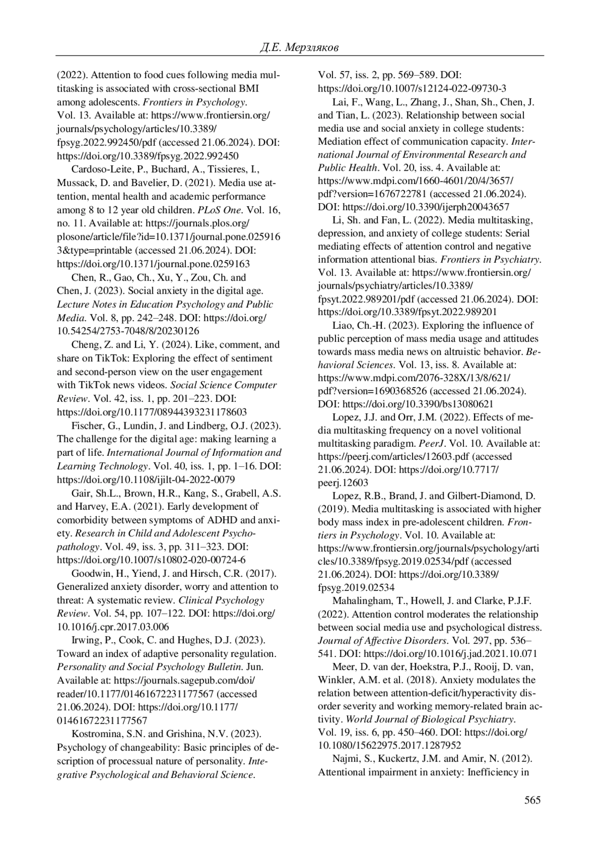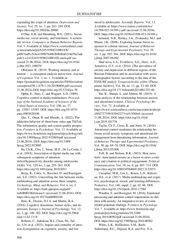 17. Li Sh., Fan L. Media multitasking, depression, and anxiety of college students: Serial mediating effects of attention control and negative information attentional bias // Frontiers in Psychiatry. 2022. Vol. 13. URL: https://www.frontiersin.org/journals/psychiatry/articles//pdf (accessed: 21.06.2024). DOI: 10.3389/fpsyt.2022.989201 EDN: RFPPDO