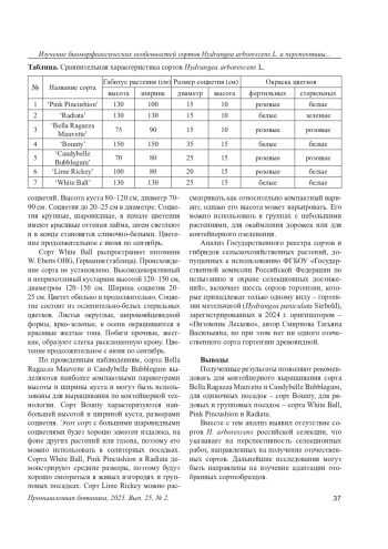 В статье рассматривается сортимент Hydrangea arborescens L. и перспективы его использования в озеленении населенных мест как перспективное решение улучшения экологической обстановки и повышения качества жизни в условиях урбанизации. Проведен биометрический анализ сортов, дана оценка их экологической и эстетической ценности. Выделены сорта, пригодные для одиночных, групповых и рядовых посадок. Низкорослые сорта с компактной формой куста могут быть рекомендованы для выращивания по контейнерной технологии. Полученные результаты позволяют рекомендовать для контейнерного выращивания сорта Bella Ragazza Mauvette и Candybelle Bubblegum, для одиночных посадок - сорт Bounty, для рядовых и групповых посадок - сорта White Ball, Pink Pincushion и Radiata.
