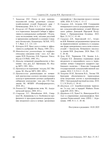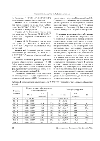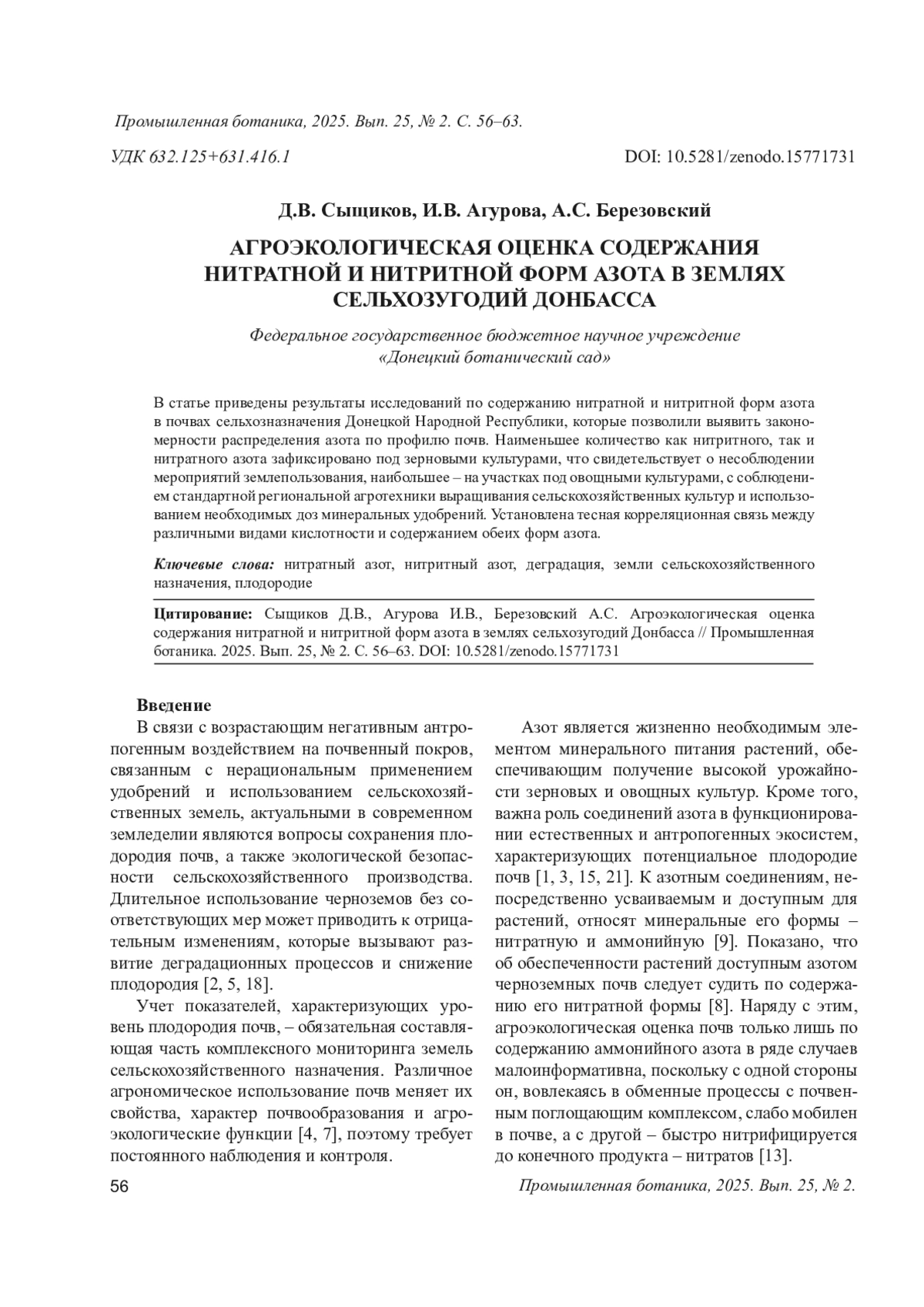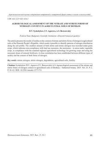 СЫЩИКОВ Д. В., АГУРОВА И. В., БЕРЕЗОВСКИЙ А. С. АГРОЭКОЛОГИЧЕСКАЯ ОЦЕНКА СОДЕРЖАНИЯ НИТРАТНОЙ И НИТРИТНОЙ ФОРМ АЗОТА В ЗЕМЛЯХ СЕЛЬХОЗУГОДИЙ ДОНБАССА // ПРОМЫШЛЕННАЯ БОТАНИКА. 2025. № 2, ТОМ 25