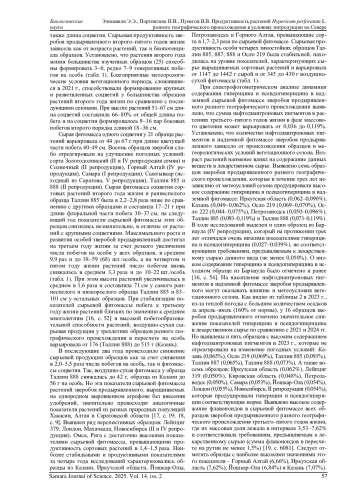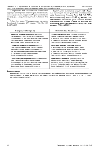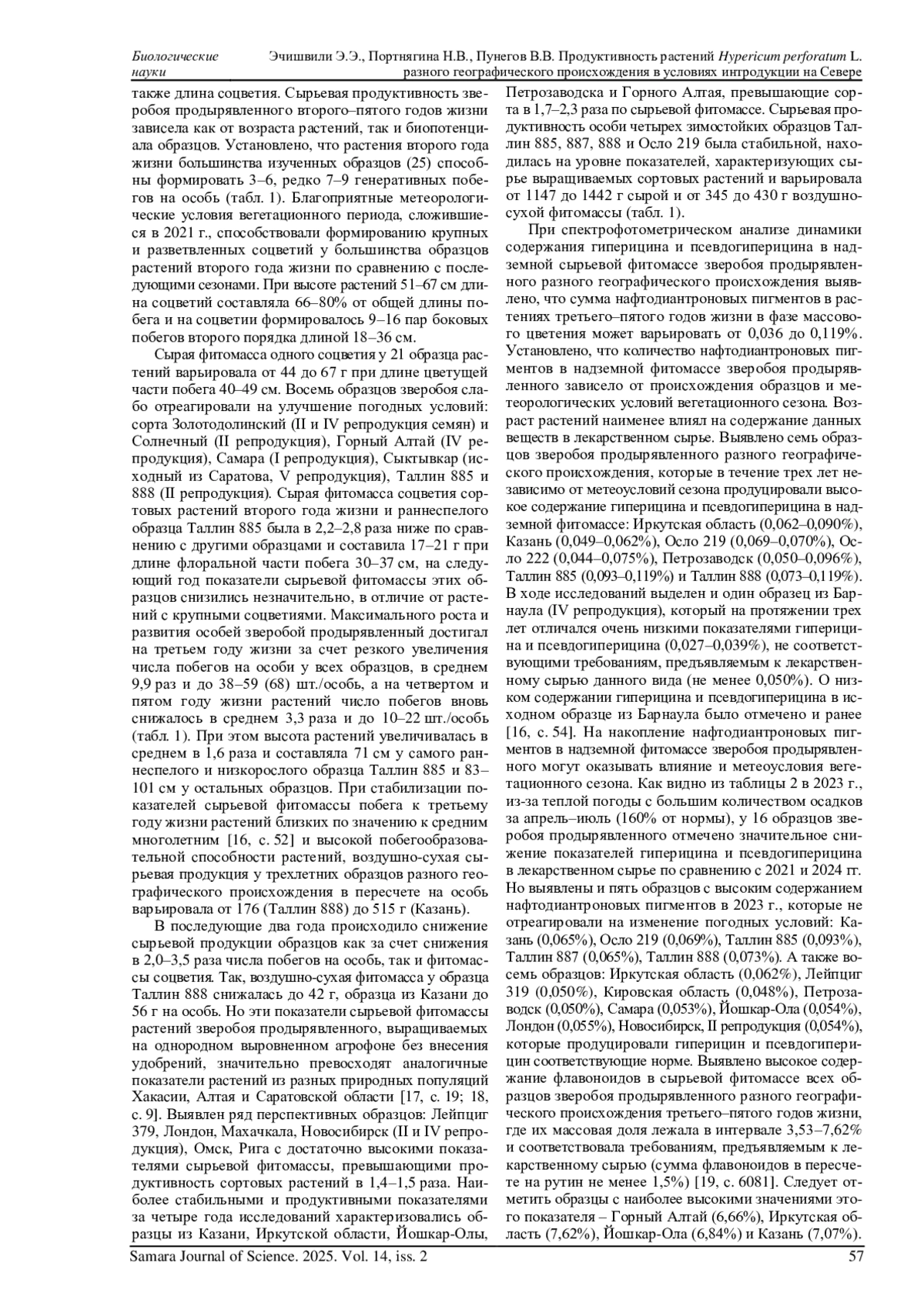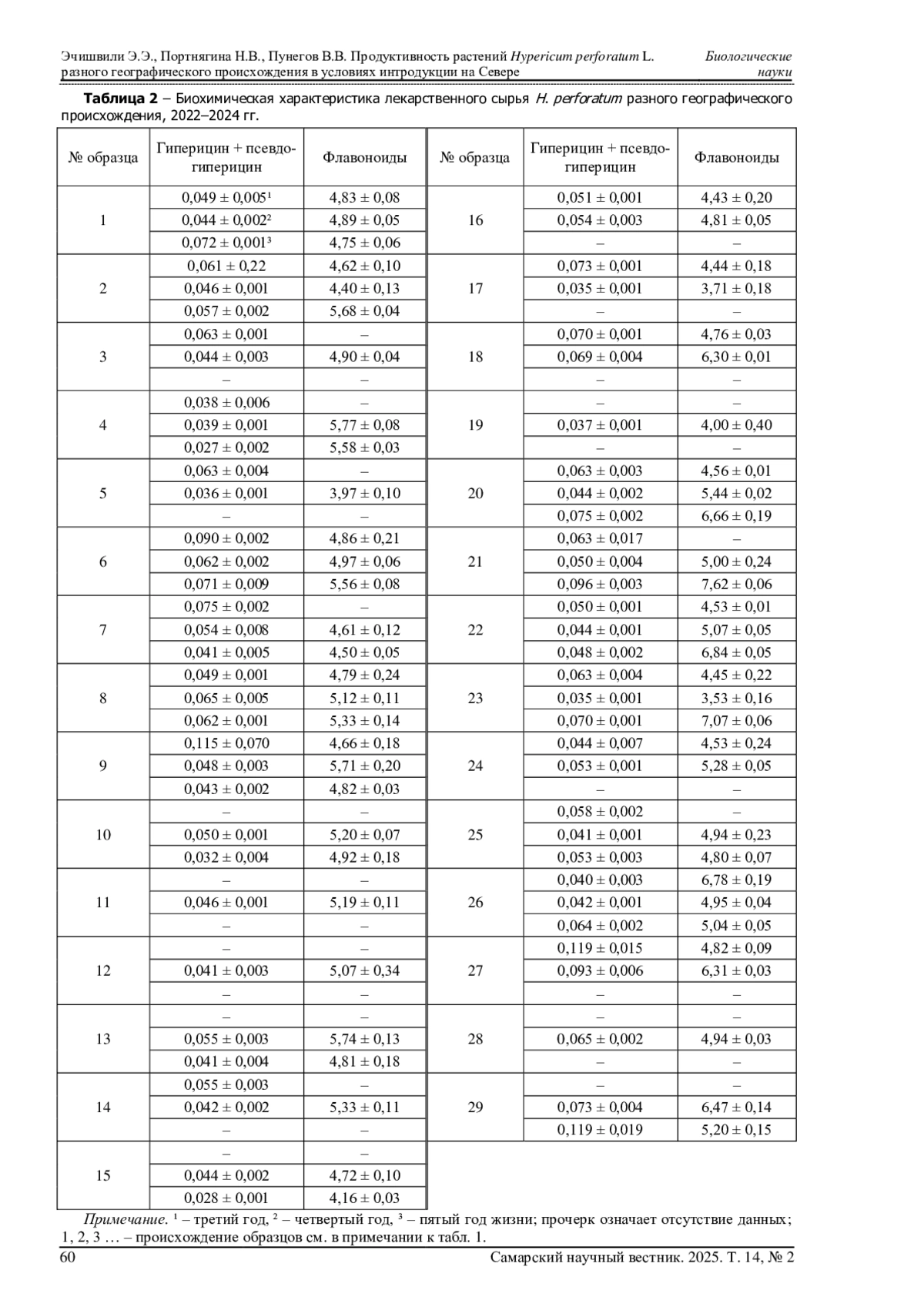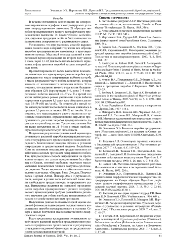 ЭЧИШВИЛИ Э. Э., ПОРТНЯГИНА Н. В., ПУНЕГОВ В. В. ПРОДУКТИВНОСТЬ РАСТЕНИЙ HYPERICUM PERFORATUM L. РАЗНОГО ГЕОГРАФИЧЕСКОГО ПРОИСХОЖДЕНИЯ В УСЛОВИЯХ ИНТРОДУКЦИИ НА СЕВЕРЕ // САМАРСКИЙ НАУЧНЫЙ ВЕСТНИК. 2025. ТОМ 14, № 2