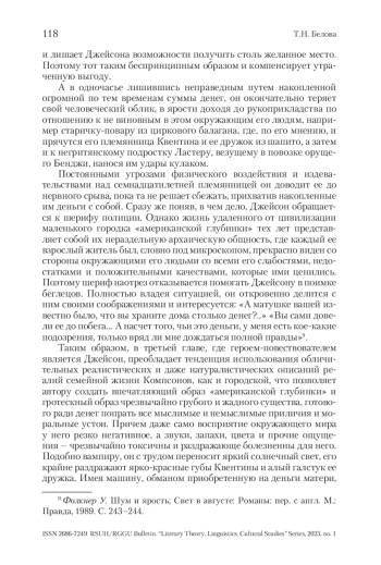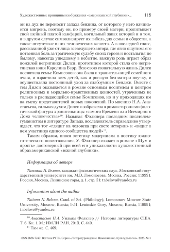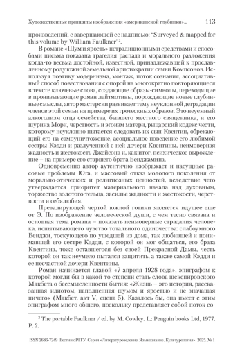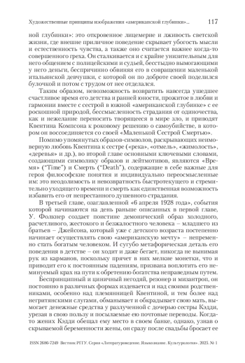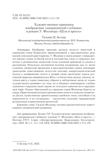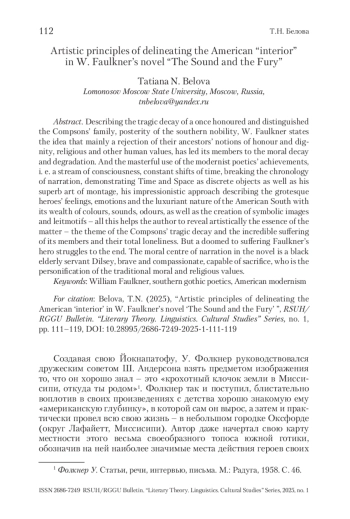 БЕЛОВА Т. Н. ХУДОЖЕСТВЕННЫЕ ПРИНЦИПЫ ИЗОБРАЖЕНИЯ «АМЕРИКАНСКОЙ ГЛУБИНКИ» В РОМАНЕ У. ФОЛКНЕРА «ШУМ И ЯРОСТЬ» // ВЕСТНИК РГГУ. СЕРИЯ «ЛИТЕРАТУРОВЕДЕНИЕ. ЯЗЫКОЗНАНИЕ. КУЛЬТУРОЛОГИЯ». 2025. № 1