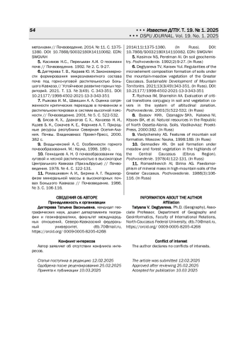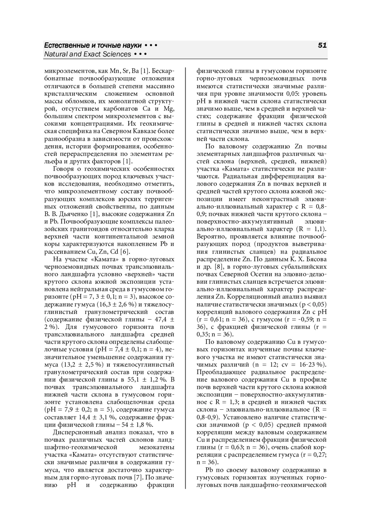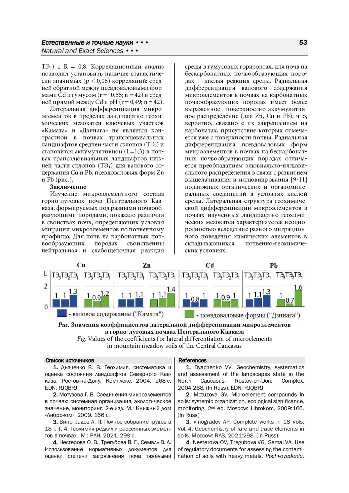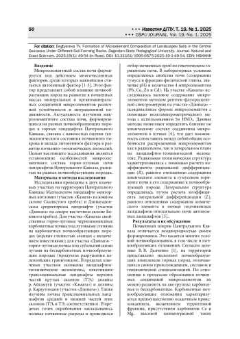 ДЕГТЯРЕВА Т. В. ФОРМИРОВАНИЕ МИКРОЭЛЕМЕНТНОГО СОСТАВА ПОЧВ ЛАНДШАФТОВ ЦЕНТРАЛЬНОГО КАВКАЗА ПОД РАЗНЫМИ ПОЧВООБРАЗУЮЩИМИ ПОРОДАМИ // ИЗВЕСТИЯ ДАГЕСТАНСКОГО ГОСУДАРСТВЕННОГО ПЕДАГОГИЧЕСКОГО УНИВЕРСИТЕТА. ЕСТЕСТВЕННЫЕ И ТОЧНЫЕ НАУКИ. 2025. № 1, ТОМ 19