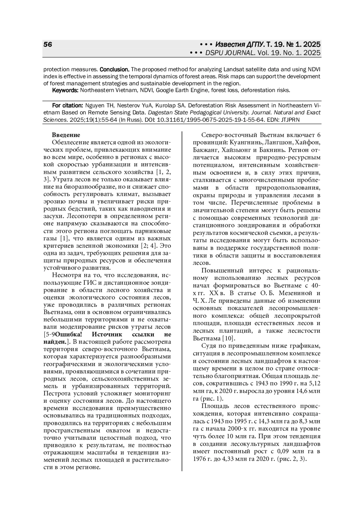 НГУЕН Ч. Х., НЕСТЕРОВ Ю. А., КУРОЛАП С. А. ОЦЕНКА РИСКА ОБЕЗЛЕСЕНИЯ ТЕРРИТОРИИ СЕВЕРО-ВОСТОЧНОГО ВЬЕТНАМА ПО МАТЕРИАЛАМ ДИСТАНЦИОННОГО ЗОНДИРОВАНИЯ // ИЗВЕСТИЯ ДАГЕСТАНСКОГО ГОСУДАРСТВЕННОГО ПЕДАГОГИЧЕСКОГО УНИВЕРСИТЕТА. ЕСТЕСТВЕННЫЕ И ТОЧНЫЕ НАУКИ. 2025. № 1, ТОМ 19