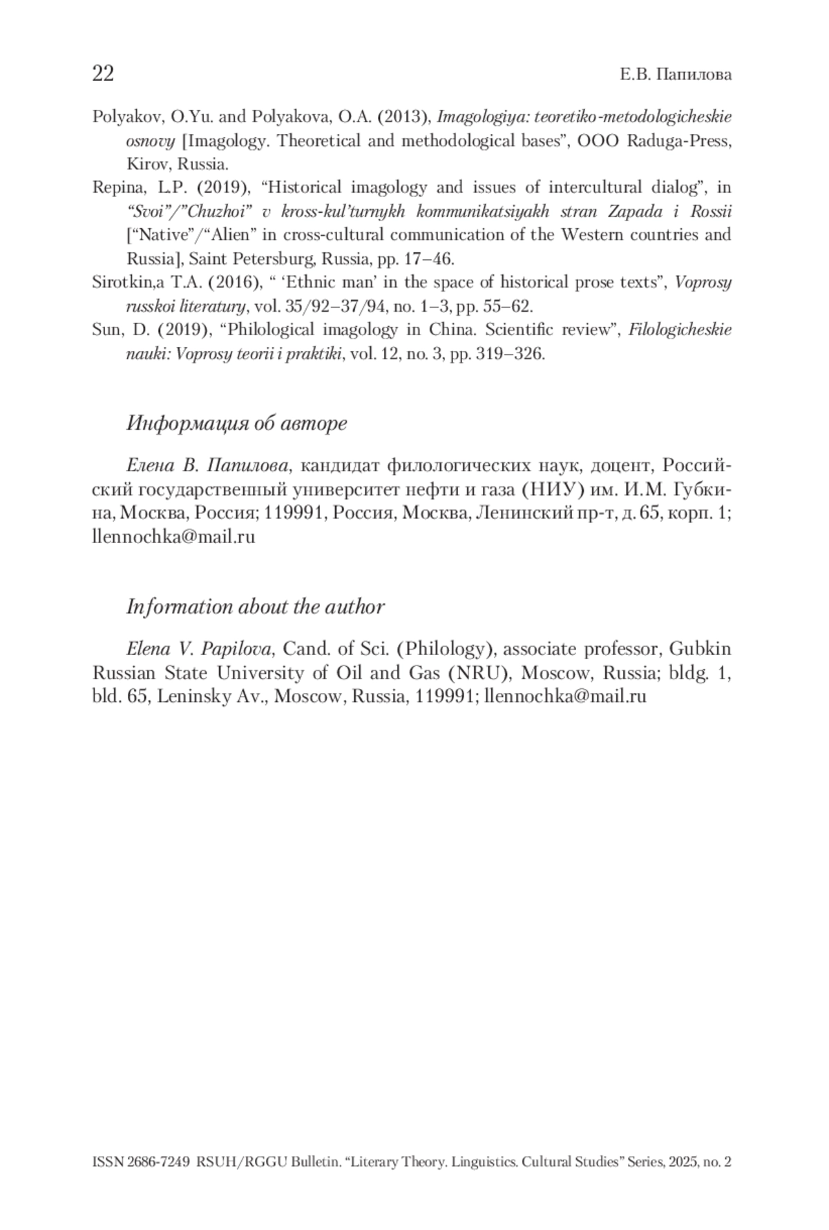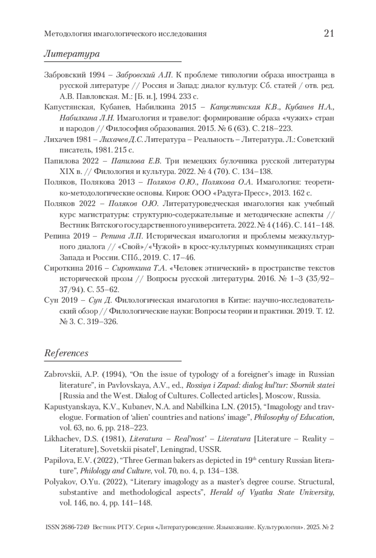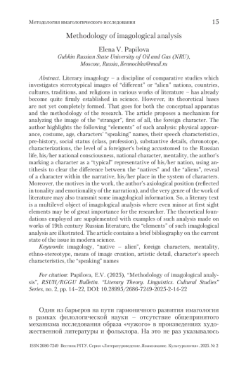 ПАПИЛОВА Е. В. МЕТОДОЛОГИЯ ИМАГОЛОГИЧЕСКОГО ИССЛЕДОВАНИЯ // ВЕСТНИК РГГУ. СЕРИЯ «ЛИТЕРАТУРОВЕДЕНИЕ. ЯЗЫКОЗНАНИЕ. КУЛЬТУРОЛОГИЯ». 2025. № 2