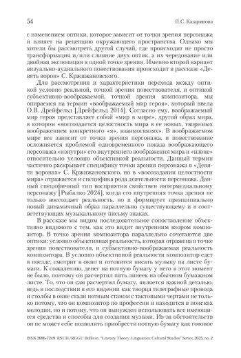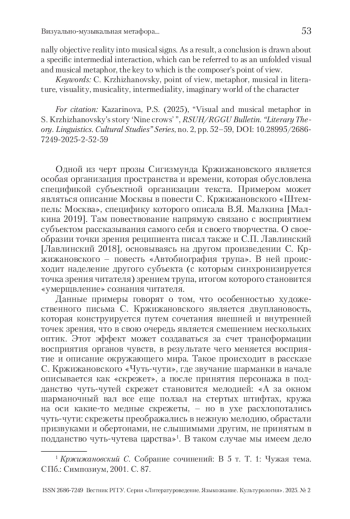Статья посвящена проблеме взаимодействия визуального и музыкального в рассказе С. Кржижановского «Девять ворон». В статье последовательно проанализирован процесс сочетания внешней точки зрения повествователя, отражающей условной объективную реальность, и субъективно-воображаемой внутренней точкой зрения композитора, в которой происходит динамичная трансформация условно объективной реальности в музыкальные знаки. В итоге делается вывод о специфичном интермедиальном взаимодействии, которое можно обозначить как развернутую визуально-музыкальную метафору, ключом к которой является точка зрения композитора.