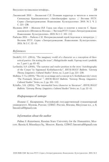 3. Малкина 2019 - Малкина В.Я. Город как образ и понятие в повести С. Кржижановского «Штемпель: Москва»// Вестник РГГУ. Серия «Литературоведение. Языкознание. Культурология». 2019. № 2. С. 101-112.