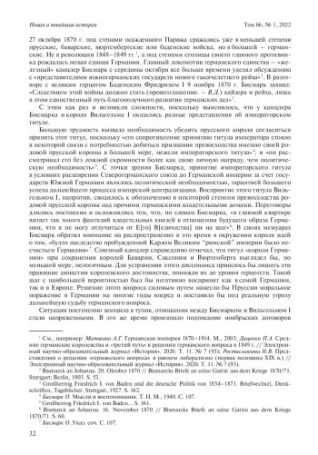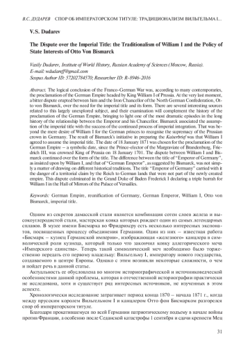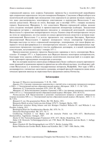 ДУДАРЕВ В. С. СПОР ОБ ИМПЕРАТОРСКОМ ТИТУЛЕ: ТРАДИЦИОНАЛИЗМ ВИЛЬГЕЛЬМА I И ПОЛИТИКА ГОСУДАРСТВЕННЫХ ИНТЕРЕСОВ ОТТО ФОН БИСМАРКА // НОВАЯ И НОВЕЙШАЯ ИСТОРИЯ. 2022. № 1