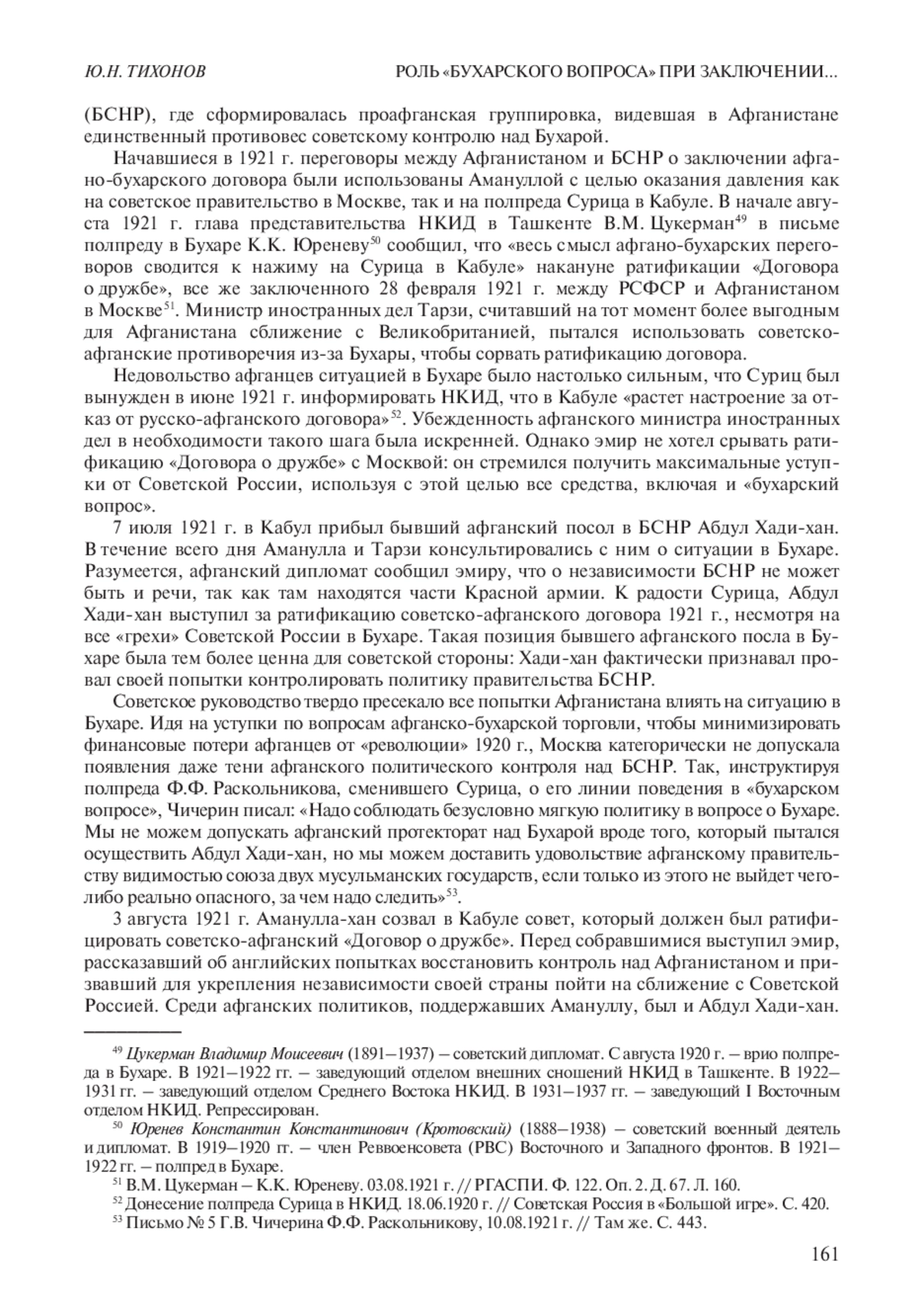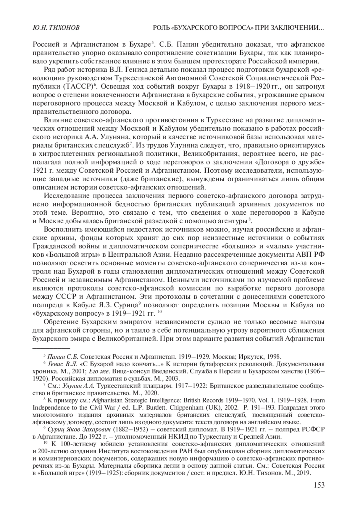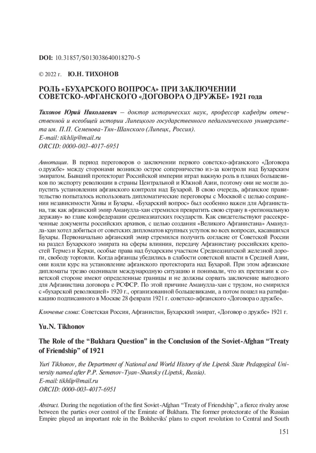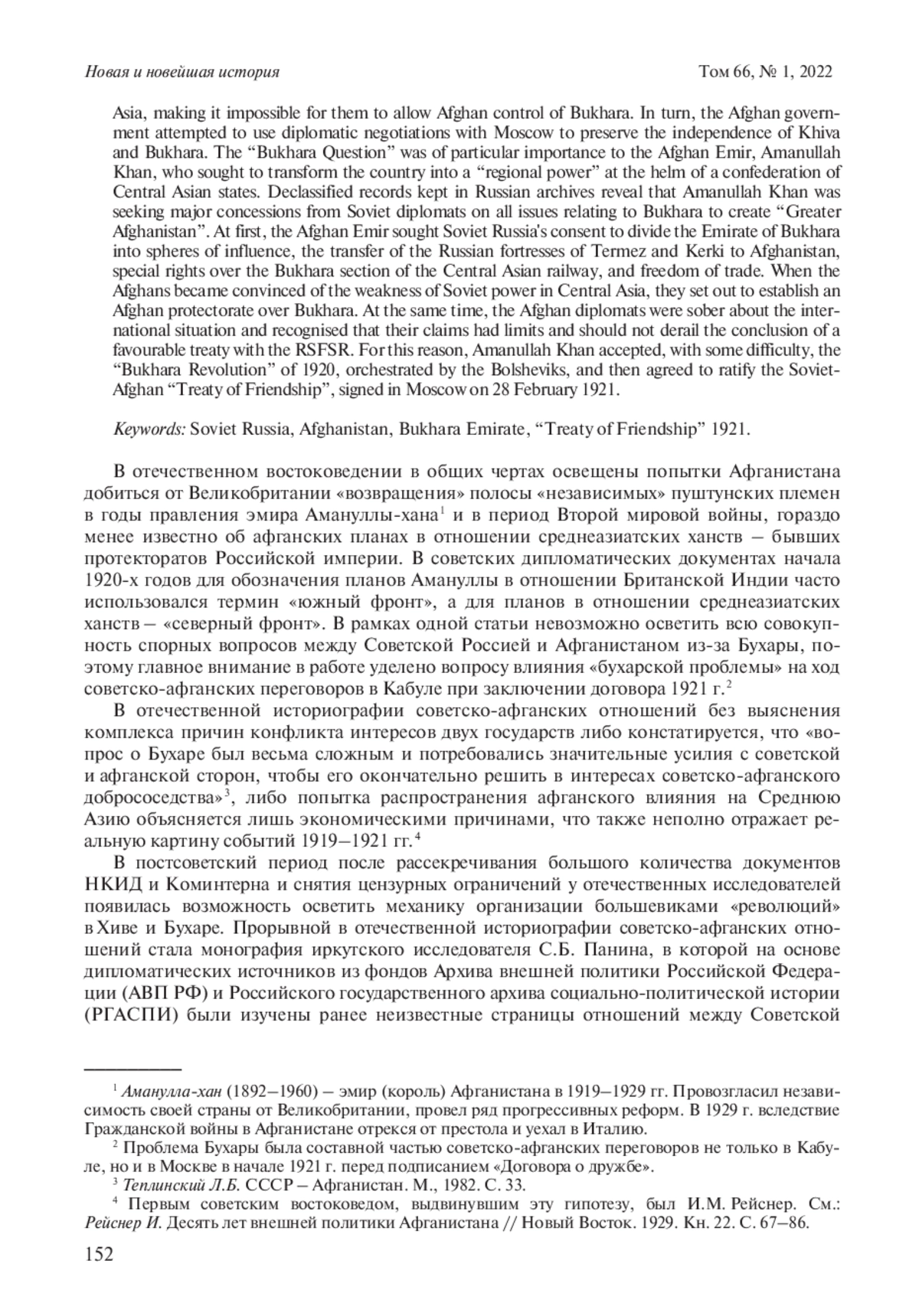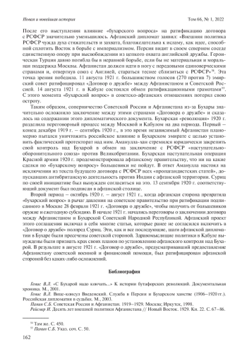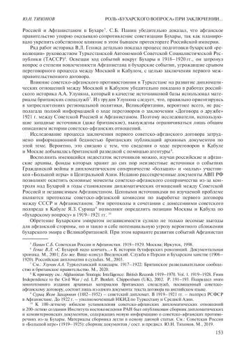 В отечественном востоковедении в общих чертах освещены попытки Афганистана добиться от Великобритании «возвращения» полосы «независимых» пуштунских племен в годы правления эмира Амануллы-хана 1 и в период Второй мировой войны, гораздо менее известно об афганских планах в отношении среднеазиатских ханств – бывших протекторатов Российской империи. В советских дипломатических документах начала 1920-х годов для обозначения планов Амануллы в отношении Британской Индии часто использовался термин «южный фронт», а для планов в отношении среднеазиатских ханств – «северный фронт». В рамках одной статьи невозможно осветить всю совокупность спорных вопросов между Советской Россией и Афганистаном из-за Бухары, поэтому главное внимание в работе уделено вопросу влияния «бухарской проблемы» на ход советско-афганских переговоров в Кабуле при заключении договора 1921 г