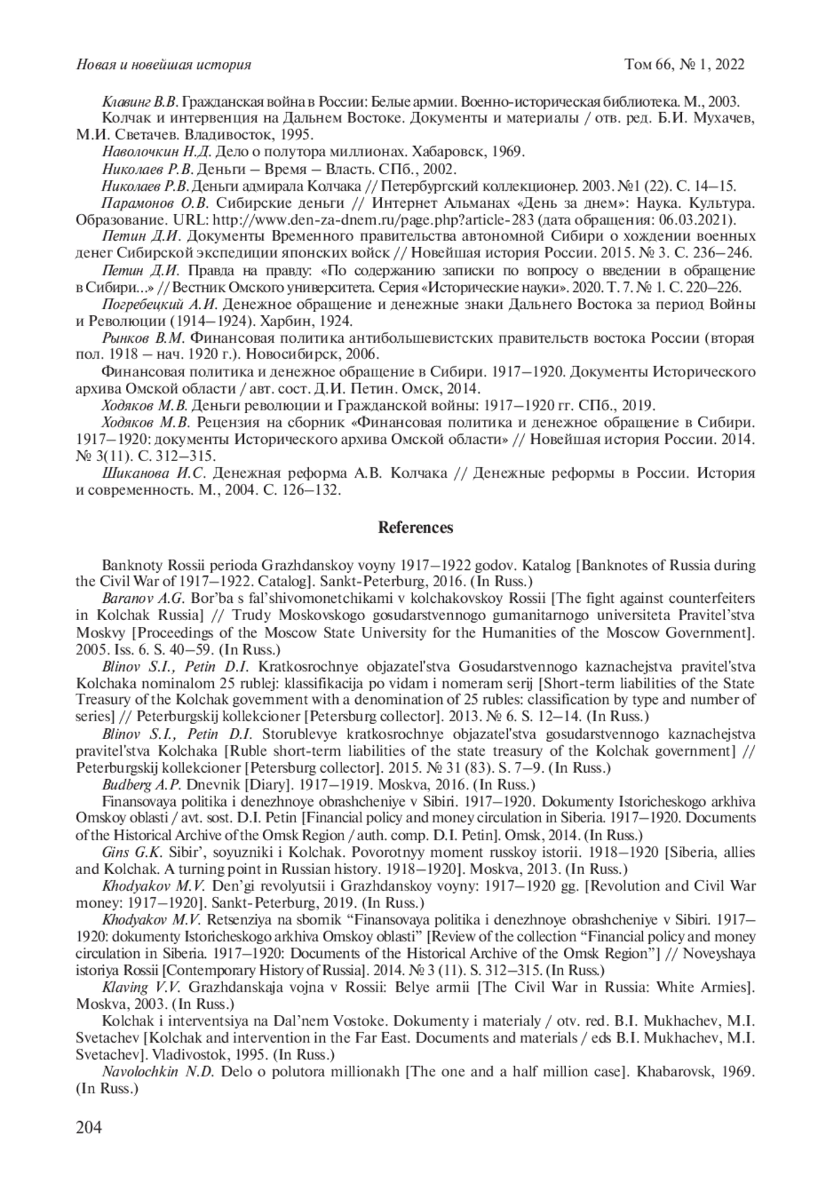 13. Петин Д.И. Документы Временного правительства автономной Сибири о хождении военных денег Сибирской экспедиции японских войск // Новейшая история России. 2015. № 3. С. 236-246. EDN: VFMZMT