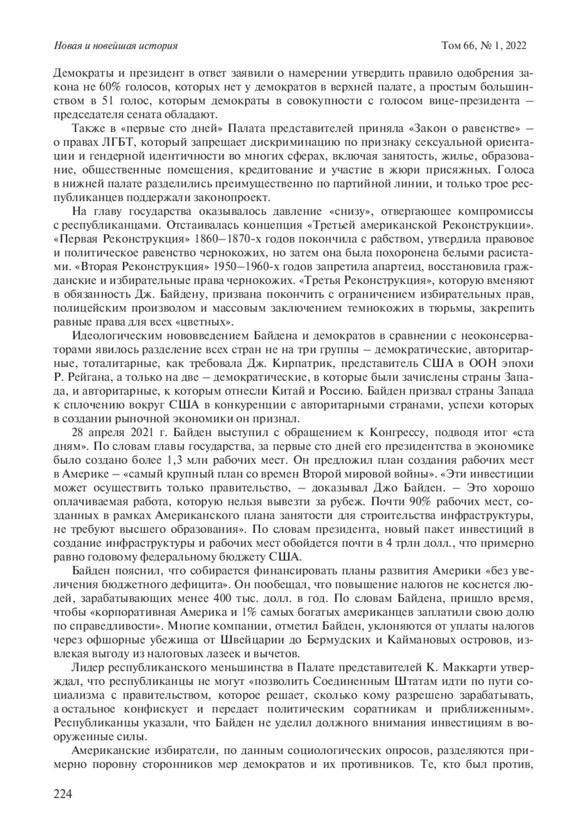 Автор стремится с профессиональной точки зрения осветить историю «прав человека» в США, приобретшую актуальное значение на современном этапе, но освещаемую соперничающими сторонами с идеологических позиций. Идеологизированные подходы обеих партий к американскому прошлому, по мнению автора, противоречат объективной картине и историзму. Автор показывает, что, несмотря на важные изменения (прежде всего Гражданскую войну 1861–1865 гг. и Реконструкцию Юга), до середины ХХ в. «права человека» в США в полном объеме распространялись только на мужчин – представителей белой расы. Затем под воздействием как внутренних проблем, так и холодной войны с СССР США провозглашали свое стремление распространить «права человека» на небелые расы и этносы. Зародились мультикультурализм и острый конфликт между ним и традиционными представлениями о «плавильном котле», закреплявшими господство в американской цивилизации за белой расой, в первую очередь англосаксами. На современном этапе достиг пика конфликт между Республиканской партией, приверженной приоритету белой расы, и Демократической партией, победившей на президентских выборах 2020 г. под лозунгами мультикультурализма и равных «прав человека» для всех рас, этносов, гендерных и иных групп американцев. В то же время в статье показывается и активное сопротивление многих американцев подобному подходу. Неудивительно, что многие мероприятия президента Д. Трампа в духе неоконсерватизма под давлением республиканцев во многом были продолжены его преемником Дж. Байденом