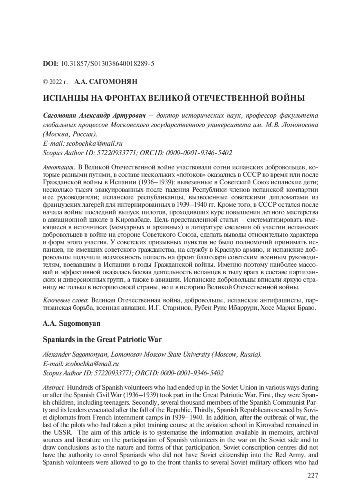 В Великой Отечественной войне участвовали сотни испанских добровольцев, которые разными путями, в составе нескольких «потоков» оказались в СССР во время или после Гражданской войны в Испании (1936–1939): вывезенные в Советский Союз испанские дети; несколько тысяч эвакуированных после падения Республики членов испанской компартии и ее руководители; испанские республиканцы, вызволенные советскими дипломатами из французских лагерей для интернированных в 1939–1940 гг. Кроме того, в СССР остался после начала войны последний выпуск пилотов, проходивших курс повышения летного мастерства в авиационной школе в Кировабаде. Цель представленной статьи – систематизировать имеющиеся в источниках (мемуарных и архивных) и литературе сведения об участии испанских добровольцев в войне на стороне Советского Союза, сделать выводы относительно характера и форм этого участия. У советских призывных пунктов не было полномочий принимать испанцев, не имевших советского гражданства, на службу в Красную армию, и испанские добровольцы получили возможность попасть на фронт благодаря советским военным руководителям, воевавшим в Испании в годы Гражданской войны. Именно поэтому наиболее массовой и эффективной оказалась боевая деятельность испанцев в тылу врага в составе партизанских и диверсионных групп, а также в авиации. Испанские добровольцы вписали яркую страницу не только в историю своей страны, но и в историю Великой Отечественной войны