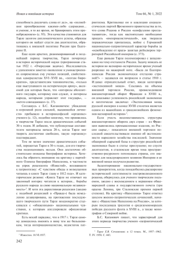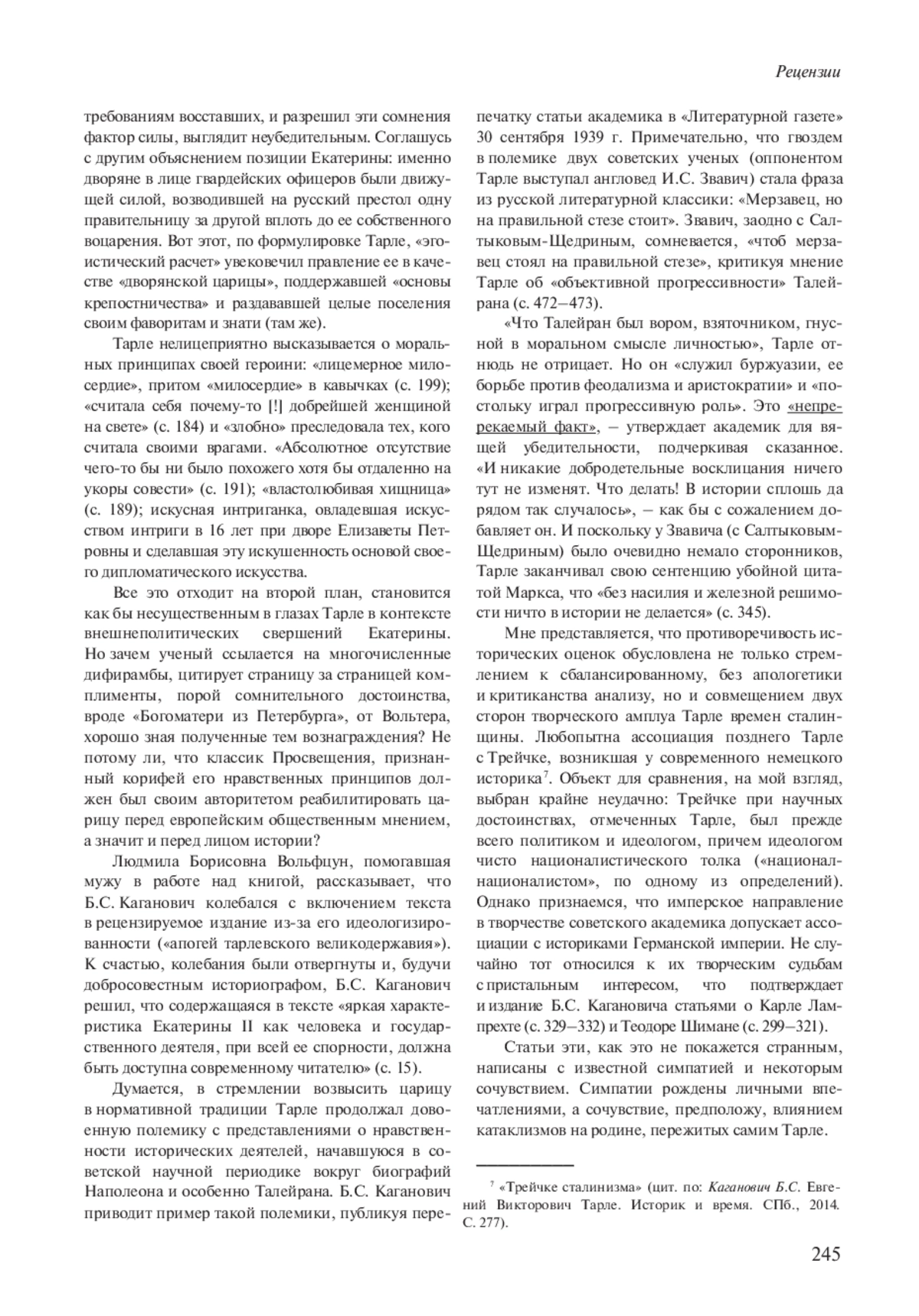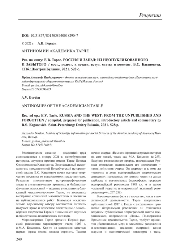 Рецензируемое издание – последний труд скончавшегося в январе 2021 г. петербургского историка, лауреата премии имени Тарле Бориса Соломоновича Кагановича. Замечательный исследователь прославленной Петербургской исторической школы Б. С. Каганович почти все свое творчество посвятил ее выдающемуся представителю. Результат многолетнего историографического труда и систематических архивных и библиографических изысканий – издание уникально публикацией «неканонического» Тарле, не вошедших в собрание сочинений малоизвестных и частично не публиковавшихся работ. Благодаря исключительно вдумчивому отбору составителя читатель получает яркое и целостное впечатление о многообразии творчества Тарле и динамике его научных и общественно-политических взглядов