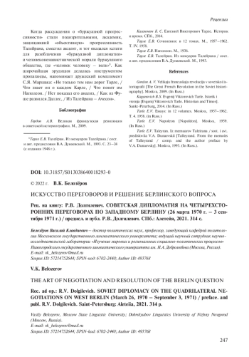 Научный интерес к. и. н. Р. В. Долгилевича в течение многих лет был сфокусирован на проблеме Западного Берлина. Завершающий эту тему труд российского германиста, основанный на документах Архива внешней политики Российской Федерации, посвящен действиям советской дипломатии на четырехсторонних переговорах, проходивших с 26 марта 1970 г. по 3 сентября 1971 г. Их результатом стало определение политического статуса Западного Берлина почти на два десятилетия