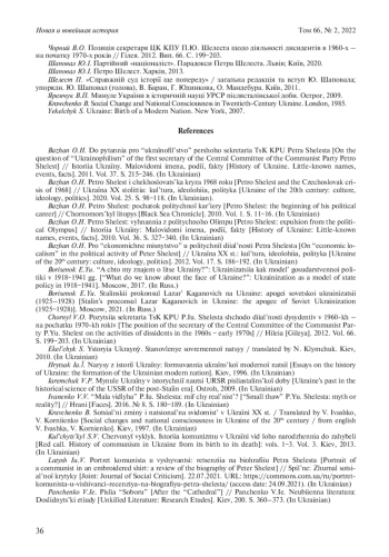 1. Бажан О.Г. До питання про “українофiльство” першого секретаря ЦК КПУ Петра Шелеста // Iсторiя України. Маловiдомi iмена, подiї, факти. 2011. Вип. 37. С. 215-246.
