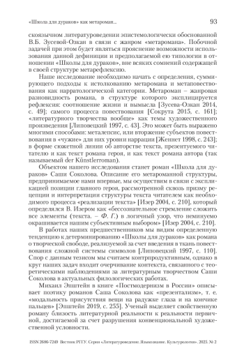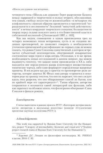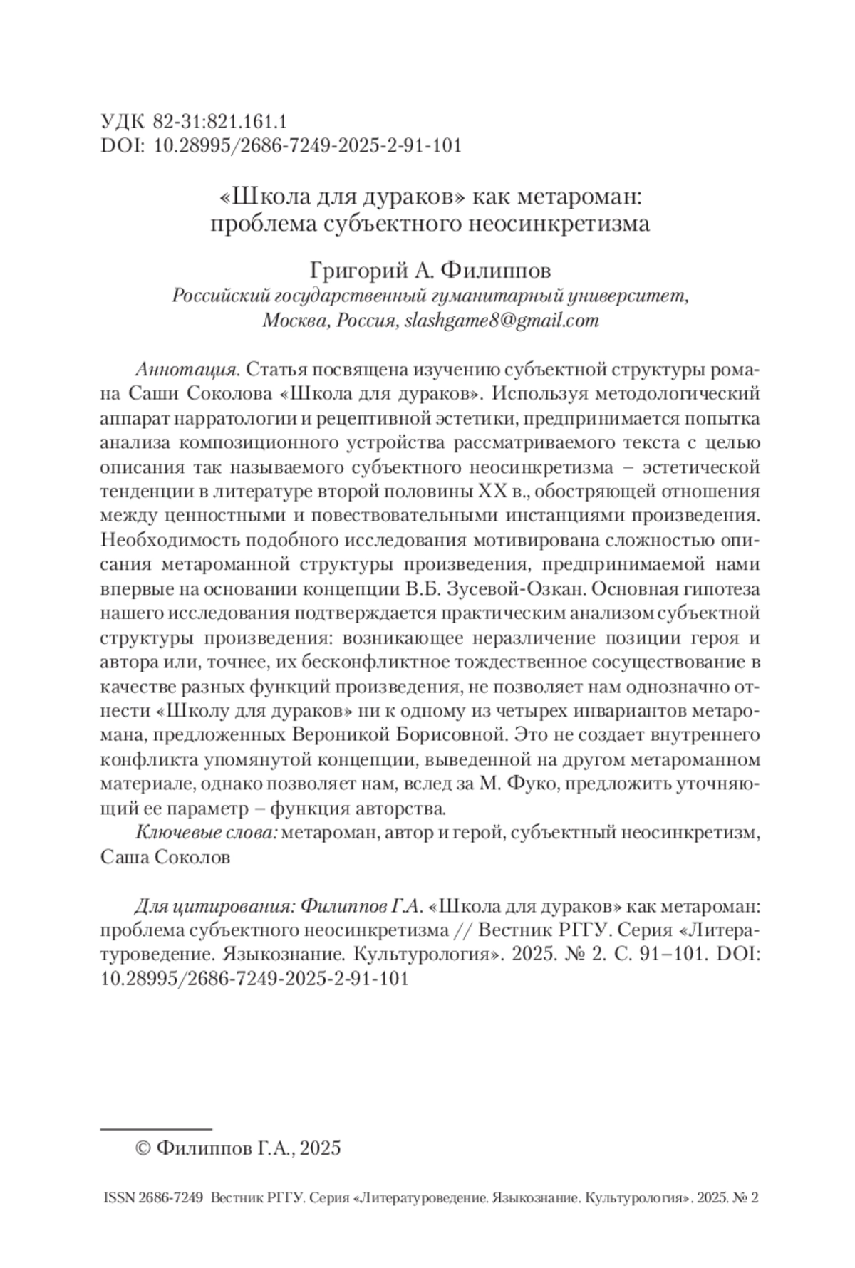 Статья посвящена изучению субъектной структуры романа Саши Соколова «Школа для дураков». Используя методологический аппарат нарратологии и рецептивной эстетики, предпринимается попытка анализа композиционного устройства рассматриваемого текста с целью описания так называемого субъектного неосинкретизма – эстетической тенденции в литературе второй половины ХХ в., обостряющей отношения между ценностными и повествовательными инстанциями произведения. Необходимость подобного исследования мотивирована сложностью описания метароманной структуры произведения, предпринимаемой нами впервые на основании концепции В. Б. Зусевой-Озкан. Основная гипотеза нашего исследования подтверждается практическим анализом субъектной структуры произведения: возникающее неразличение позиции героя и автора или, точнее, их бесконфликтное тождественное сосуществование в качестве разных функций произведения, не позволяет нам однозначно отнести «Школу для дураков» ни к одному из четырех инвариантов метаромана, предложенных Вероникой Борисовной. Это не создает внутреннего конфликта упомянутой концепции, выведенной на другом метароманном материале, однако позволяет нам, вслед за М. Фуко, предложить уточняющий ее параметр – функция авторства.