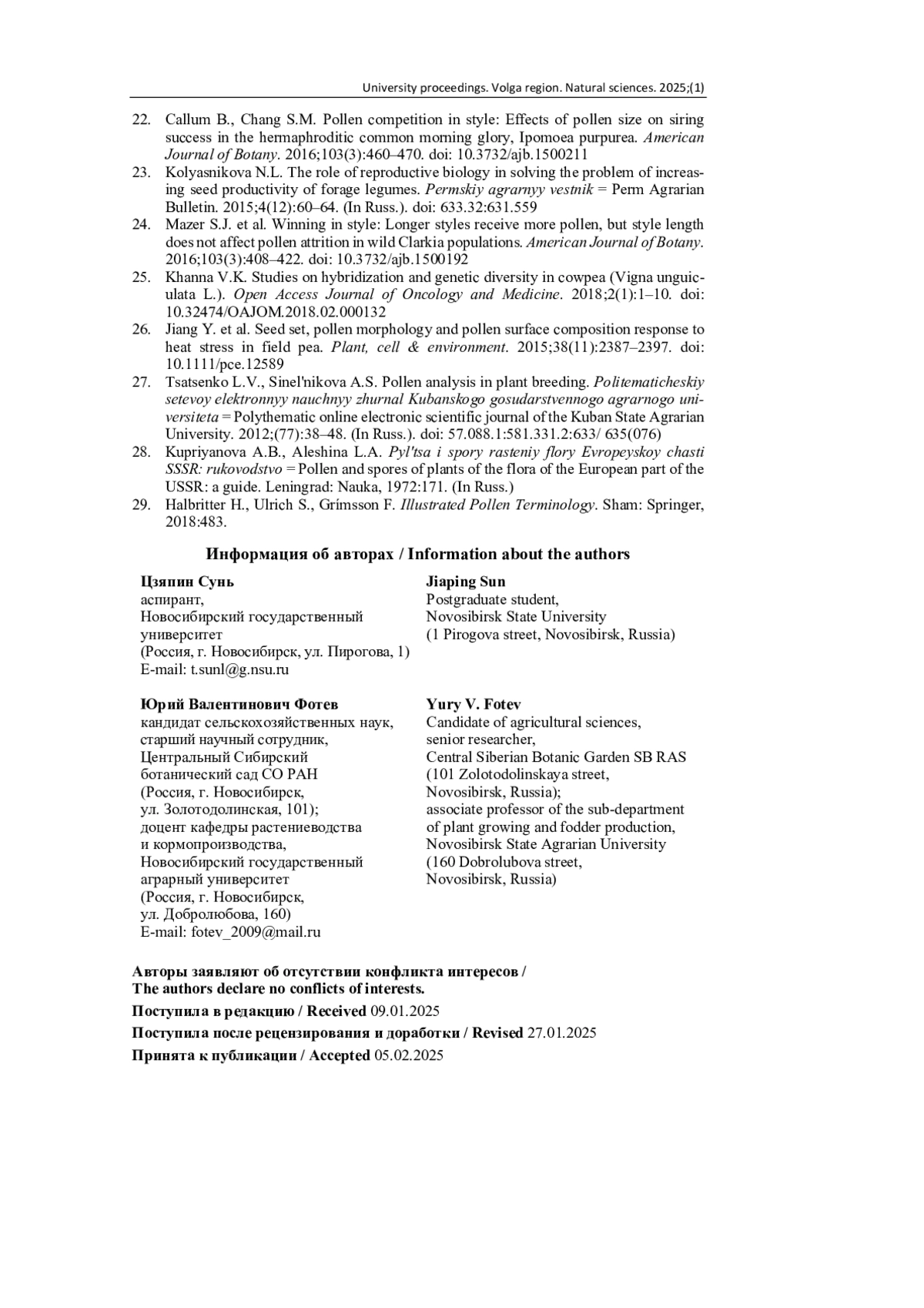 26. Jiang Y. [et al.]. Seed set, pollen morphology and pollen surface composition response to heat stress in field pea // Plant, cell & environment. 2015. Vol. 38, № 11. P. 2387-2397. DOI: 10.1111/pce.12589