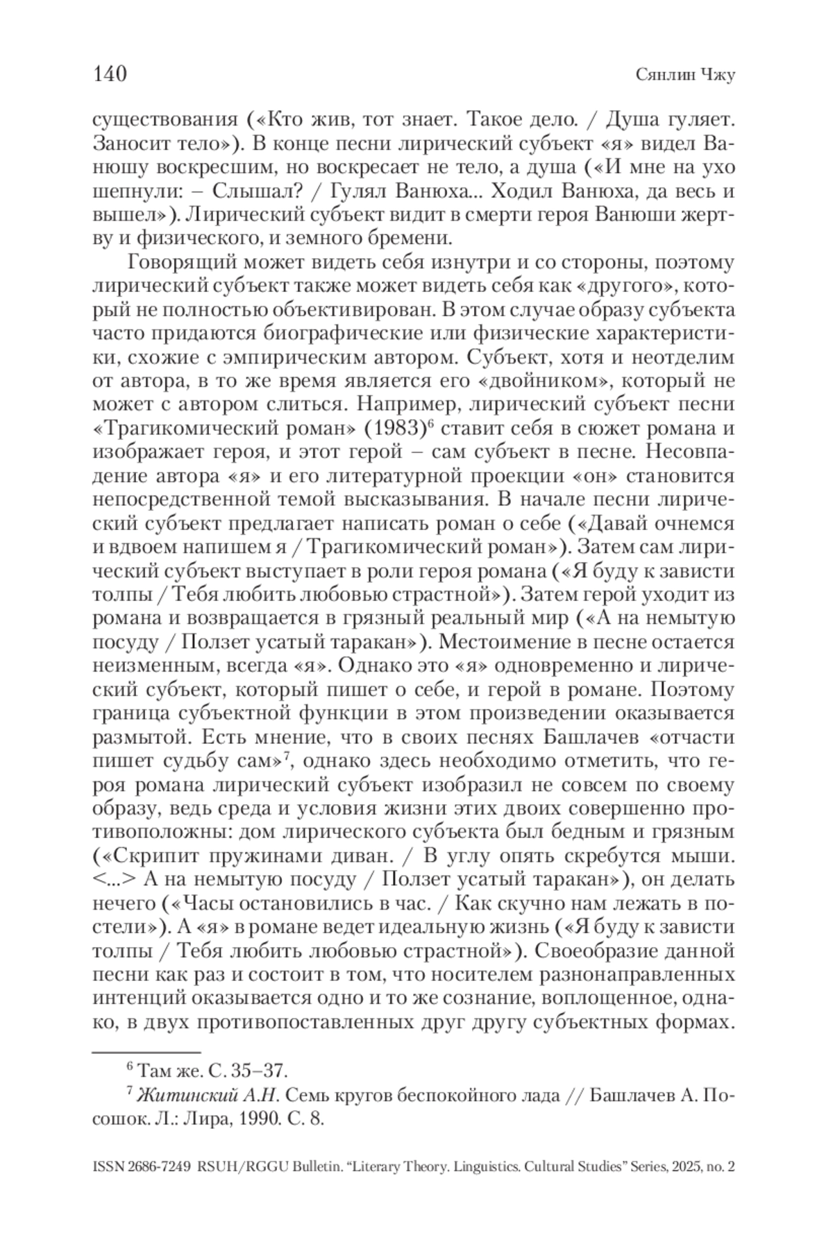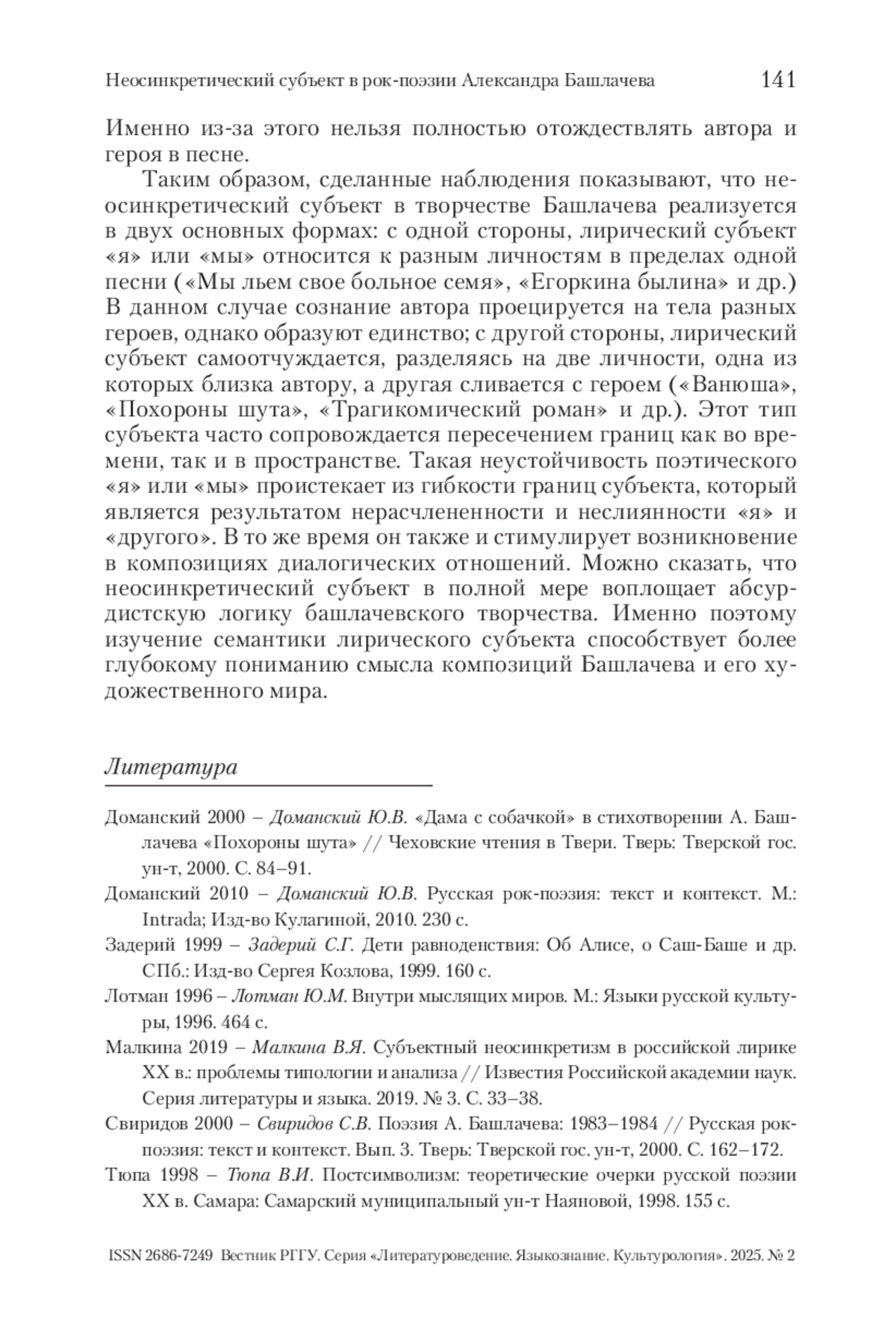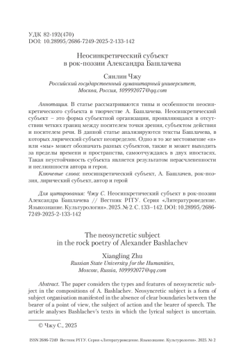 ЧЖУ С. НЕОСИНКРЕТИЧЕСКИЙ СУБЪЕКТ В РОК-ПОЭЗИИ АЛЕКСАНДРА БАШЛАЧЕВА // ВЕСТНИК РГГУ. СЕРИЯ «ЛИТЕРАТУРОВЕДЕНИЕ. ЯЗЫКОЗНАНИЕ. КУЛЬТУРОЛОГИЯ». 2025. № 2