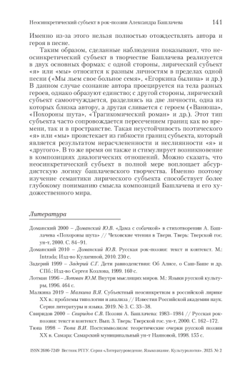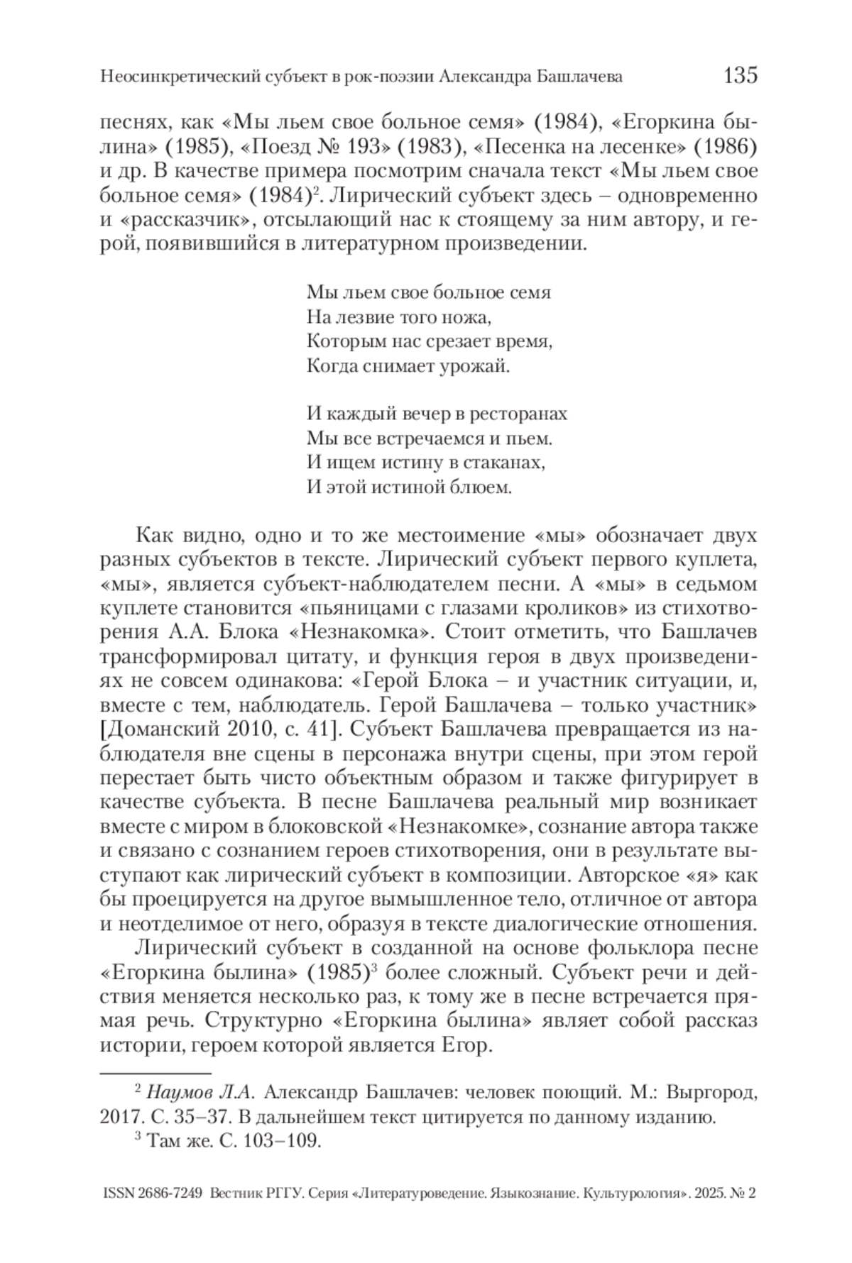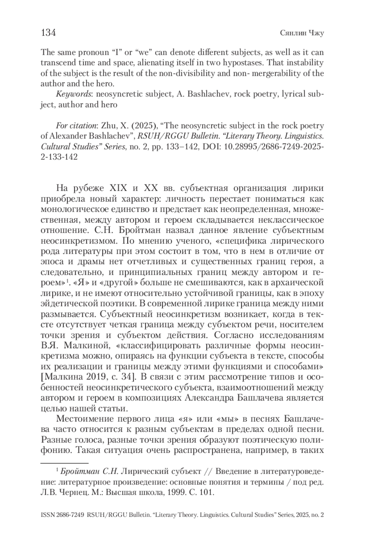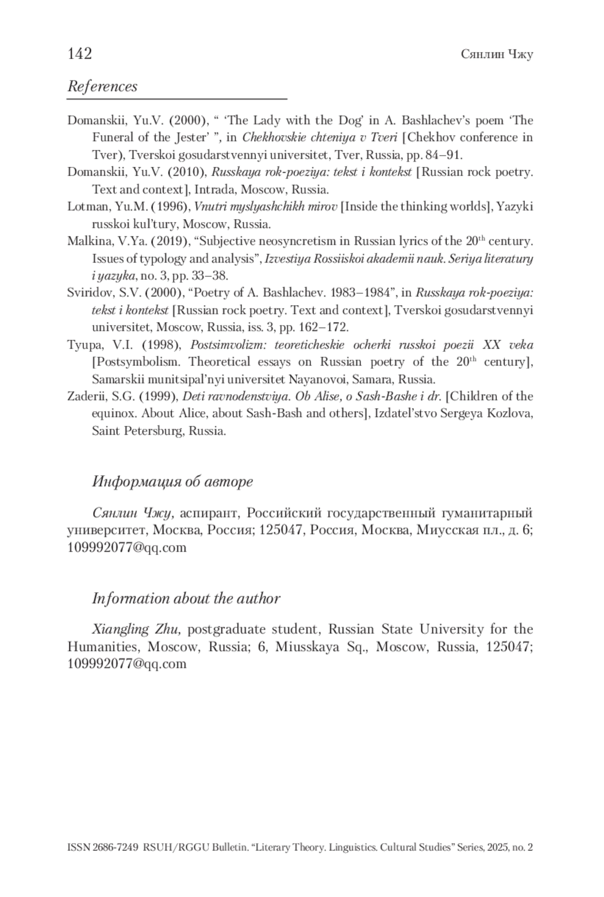 ЧЖУ С. НЕОСИНКРЕТИЧЕСКИЙ СУБЪЕКТ В РОК-ПОЭЗИИ АЛЕКСАНДРА БАШЛАЧЕВА // ВЕСТНИК РГГУ. СЕРИЯ «ЛИТЕРАТУРОВЕДЕНИЕ. ЯЗЫКОЗНАНИЕ. КУЛЬТУРОЛОГИЯ». 2025. № 2