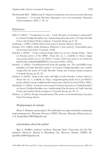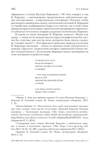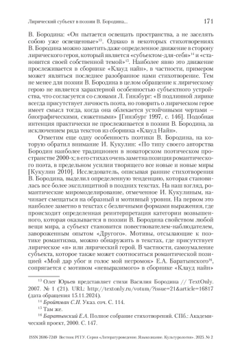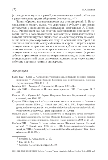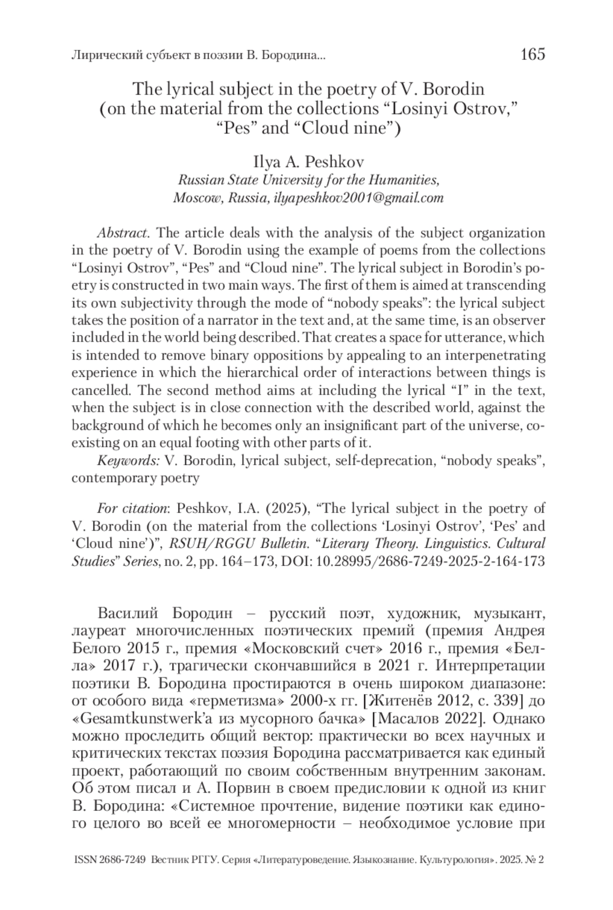 ПЕШКОВ И. А. ЛИРИЧЕСКИЙ СУБЪЕКТ В ПОЭЗИИ В. БОРОДИНА (НА МАТЕРИАЛЕ СБОРНИКОВ «ЛОСИНЫЙ ОСТРОВ», «ПЕС» И «КЛАУД НАЙН») // ВЕСТНИК РГГУ. СЕРИЯ «ЛИТЕРАТУРОВЕДЕНИЕ. ЯЗЫКОЗНАНИЕ. КУЛЬТУРОЛОГИЯ». 2025. № 2