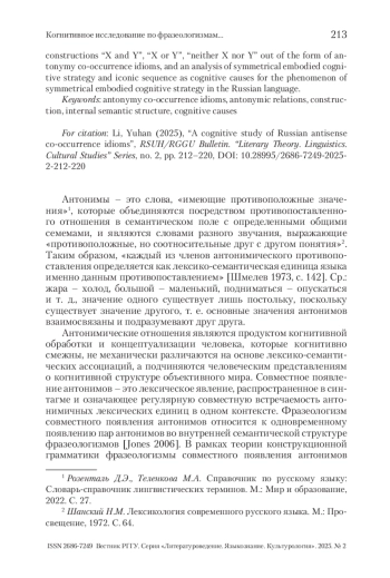 ЛИ Ю. КОГНИТИВНОЕ ИССЛЕДОВАНИЕ ПО ФРАЗЕОЛОГИЗМАМ СОВМЕСТНОГО ПОЯВЛЕНИЯ АНТОНИМОВ В РУССКОМ ЯЗЫКЕ // ВЕСТНИК РГГУ. СЕРИЯ «ЛИТЕРАТУРОВЕДЕНИЕ. ЯЗЫКОЗНАНИЕ. КУЛЬТУРОЛОГИЯ». 2025. № 2